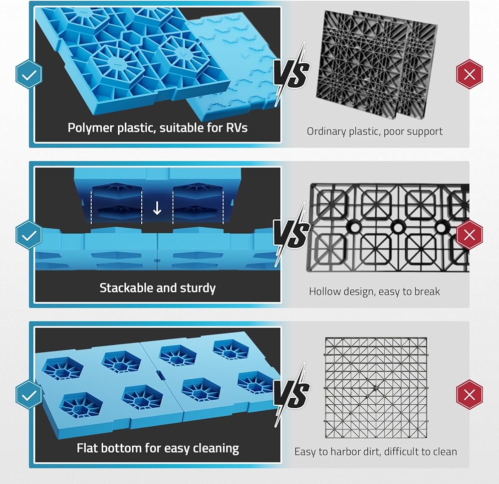 هيكل متين وقوي: كتل التسوية هذه مصنوعة من مواد معززة عالية الكثافة، وهي مصممة لتحمل الوزن الهائل وتوفير أداء طويل الأمد. تقاوم كتل تسوية المركبات الترفيهية الخاصة بنا أيضًا التعرض للأشعة فوق البنفسجية والماء ودرجات الحرارة القصوى.