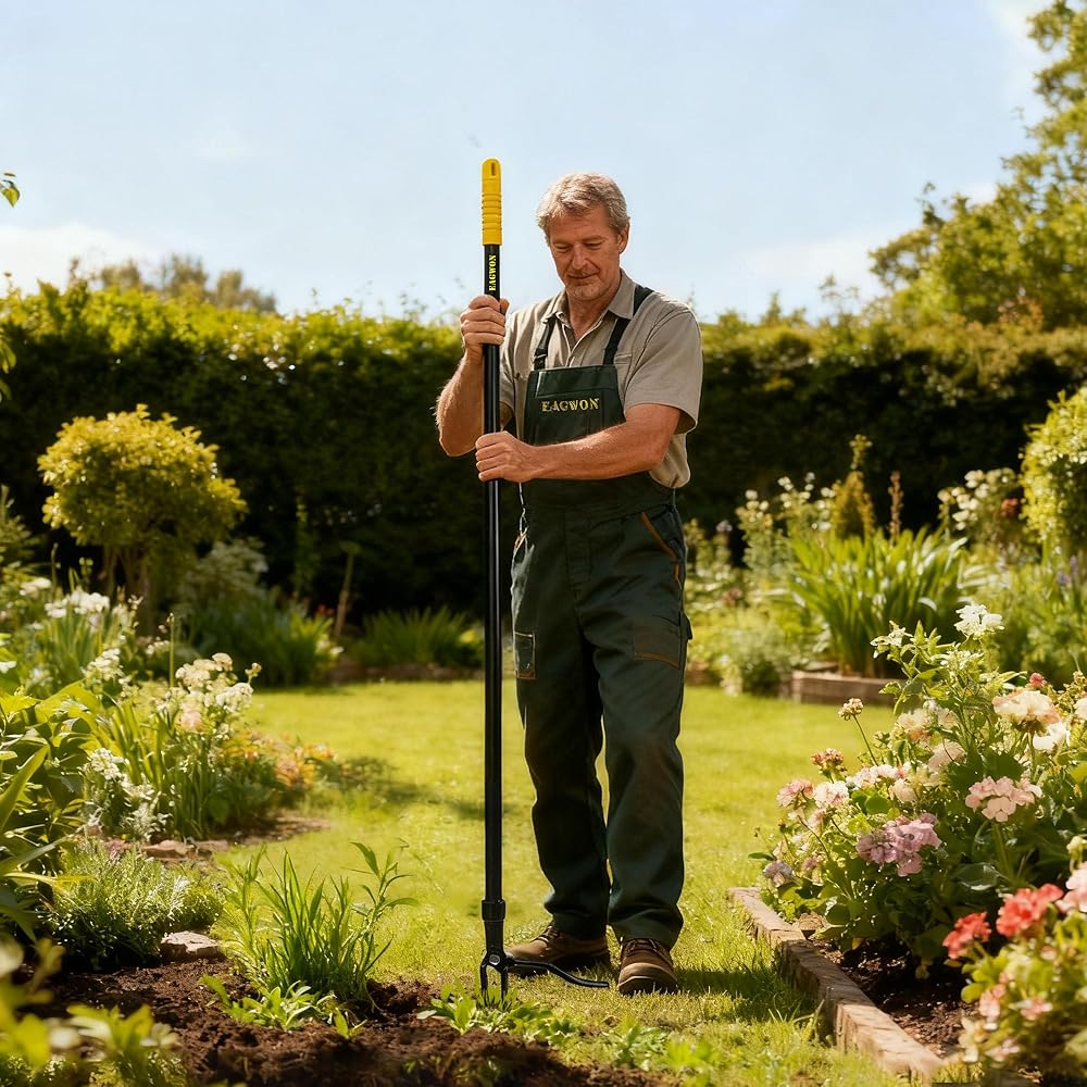 Transform your garden maintenance with this 55-inch stand-up weed puller tool, featuring an innovative 4-claw steel head design that makes weed removal effortless and back-friendly. The long-handled design eliminates the need to bend or kneel, making it perfect for tackling stubborn weeds like crabgrass, dandelions, thistle, and wild onions. The durable steel construction ensures reliable performance, while the specialized claw mechanism firmly grips deep-rooted weeds for complete removal. This tool is particularly effective against taproot and fibrous root systems, pulling weeds out from the root to prevent regrowth. The ergonomic design reduces strain during extended use, and the sturdy construction prevents snapping or slipping during operation. Whether you're dealing with creeping charlie or persistent crabgrass, this weed puller provides a practical solution for maintaining a weed-free garden. The extended reach and standing position make it an excellent choice for users who want to maintain their garden without the physical strain of traditional weeding methods.