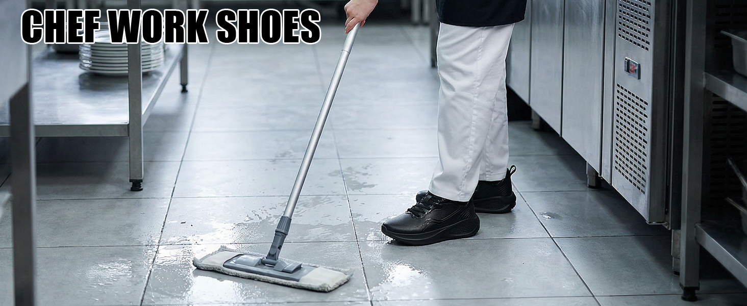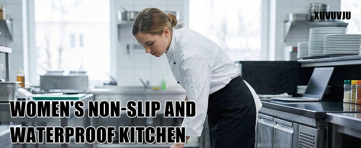 • حماية فائقة ضد الانزلاق والماء: نعل خارجي متطور مضاد للانزلاق يؤمن خطواتك على أرضيات المطبخ الدهنية. الجزء العلوي مقاوم للماء بالكامل يحافظ على جفاف القدمين من الانسكابات والبقع، مما يضمن السلامة والراحة طوال اليوم.