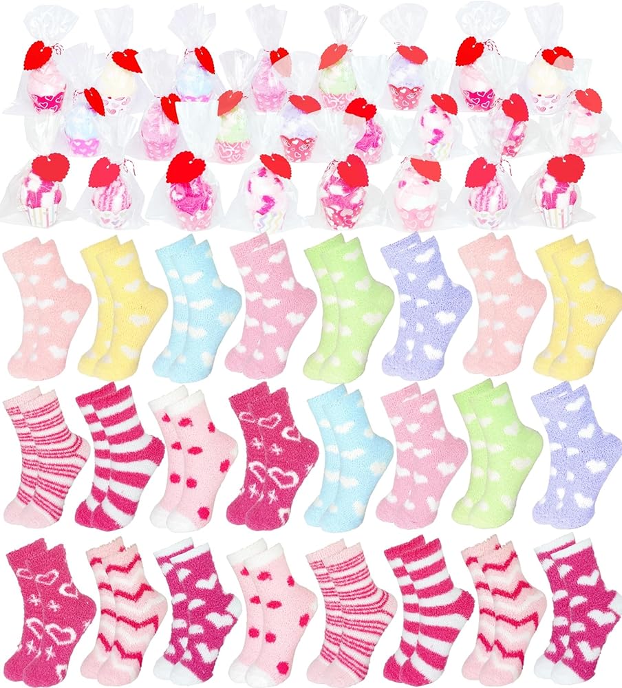 • GIFT SET CONTENTS: 24 pairs of Valentine's Day furry socks set includes heart-shaped cards, gift bags, and ropes for DIY cupcake-style packaging, assemble your own special cupcake socks, making every gift personal and memorable, perfect for Valentine's Day, Christmas, or birthday giving
