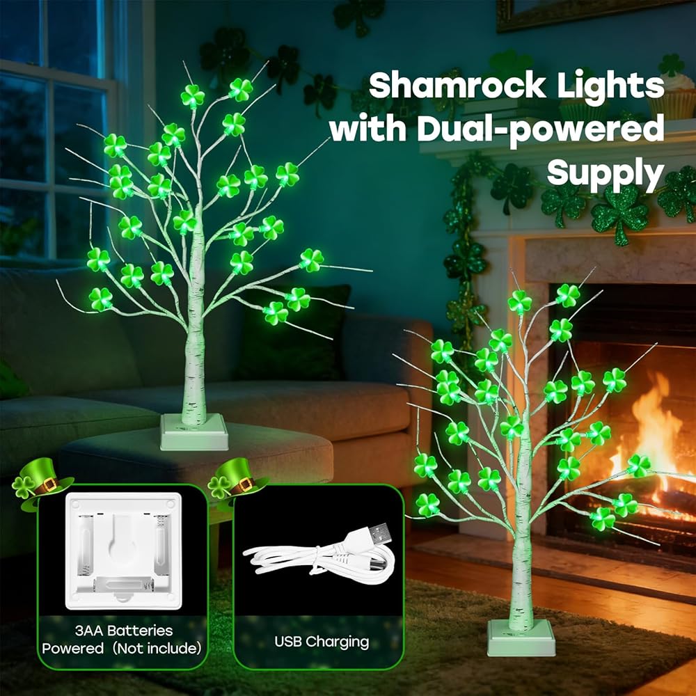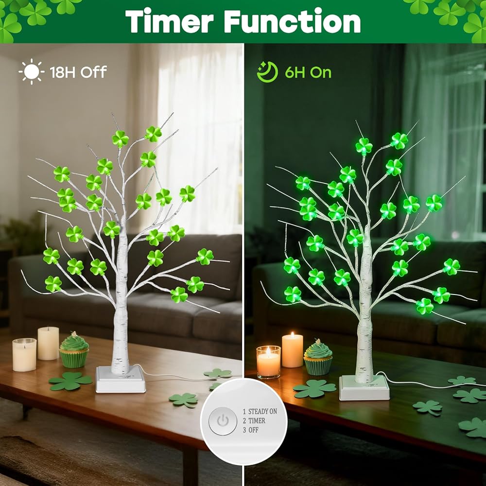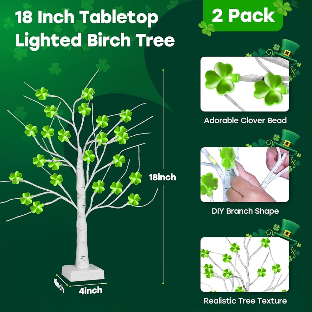 2 حزمة مؤقت ديكورات شجرة عيد القديس باتريك، 18 بوصة 24 LED منضدية أضواء شجرة عيد القديس باتريك مع نبات النفل ثلاثي الأبعاد، USB وبطارية تعمل بالديكور الداخلي لعيد القديس باتريك في المنزل
