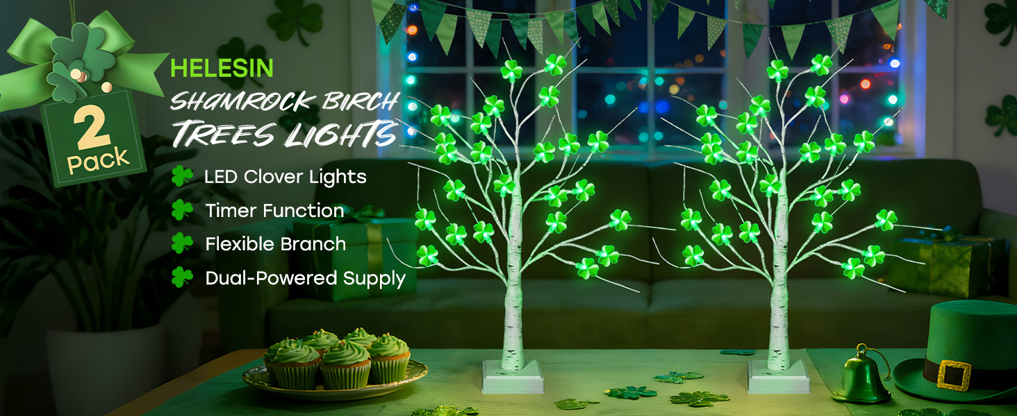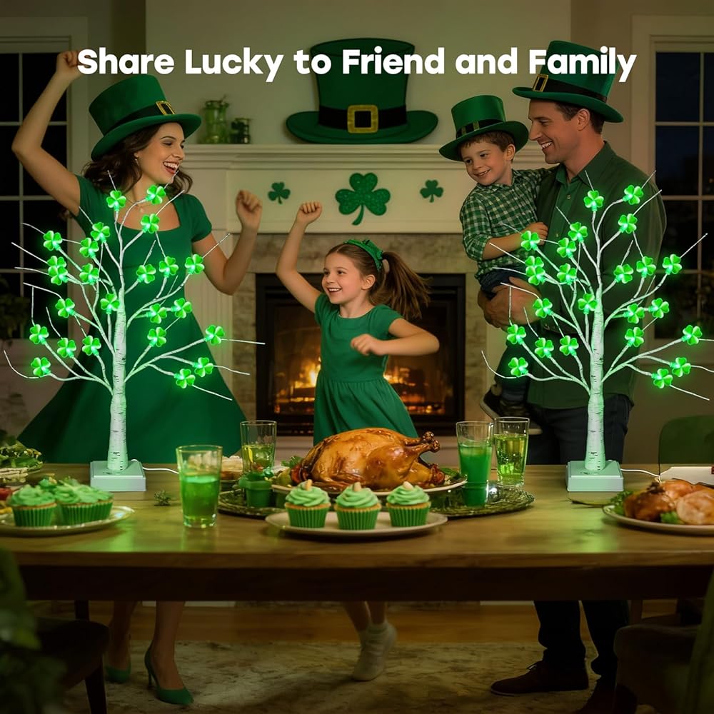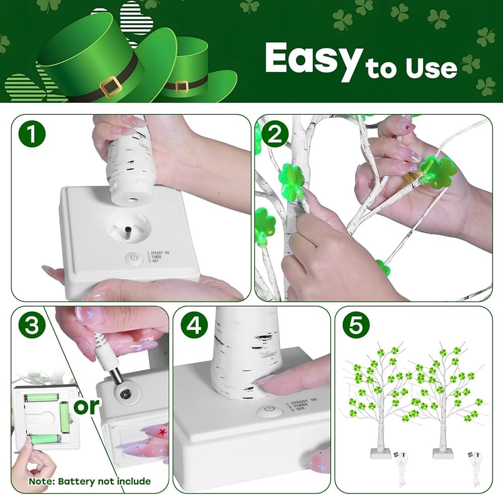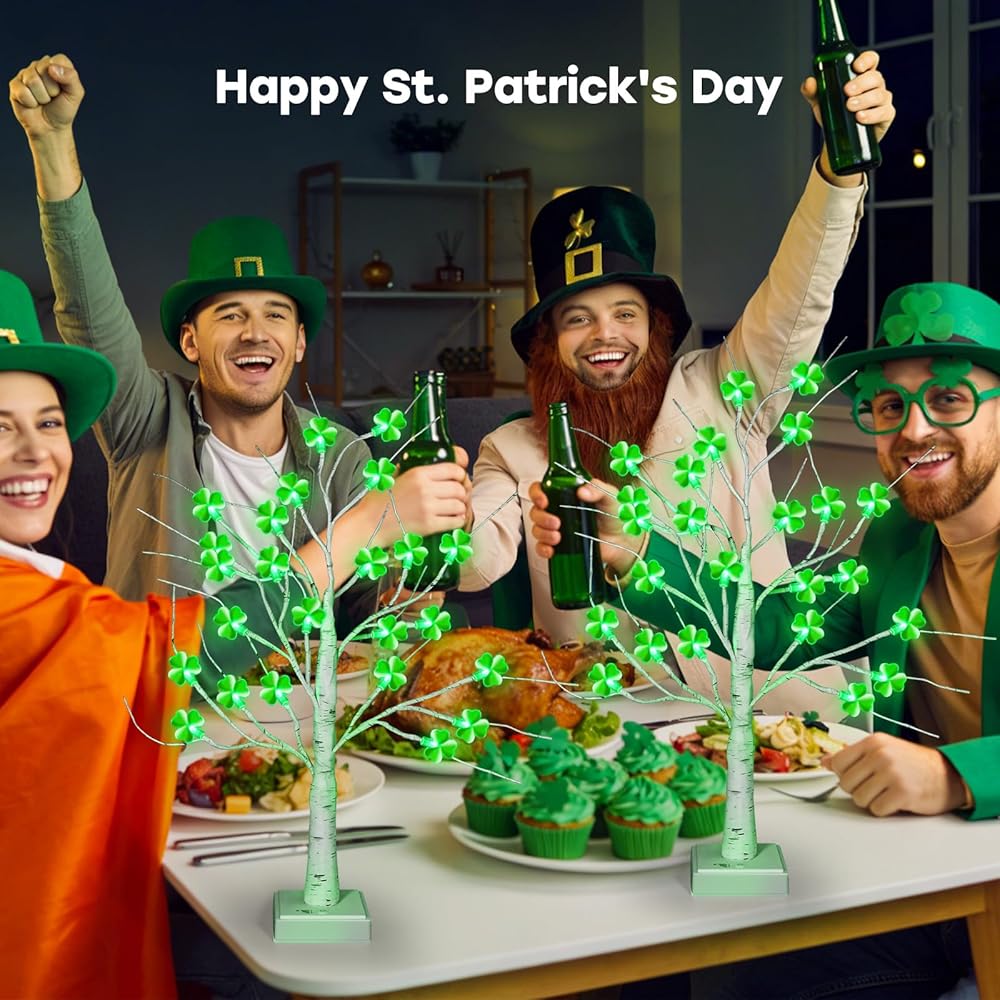 2 حزمة مؤقت ديكورات شجرة عيد القديس باتريك، 18 بوصة 24 LED منضدية أضواء شجرة عيد القديس باتريك مع نبات النفل ثلاثي الأبعاد، USB وبطارية تعمل بالديكور الداخلي لعيد القديس باتريك في المنزل