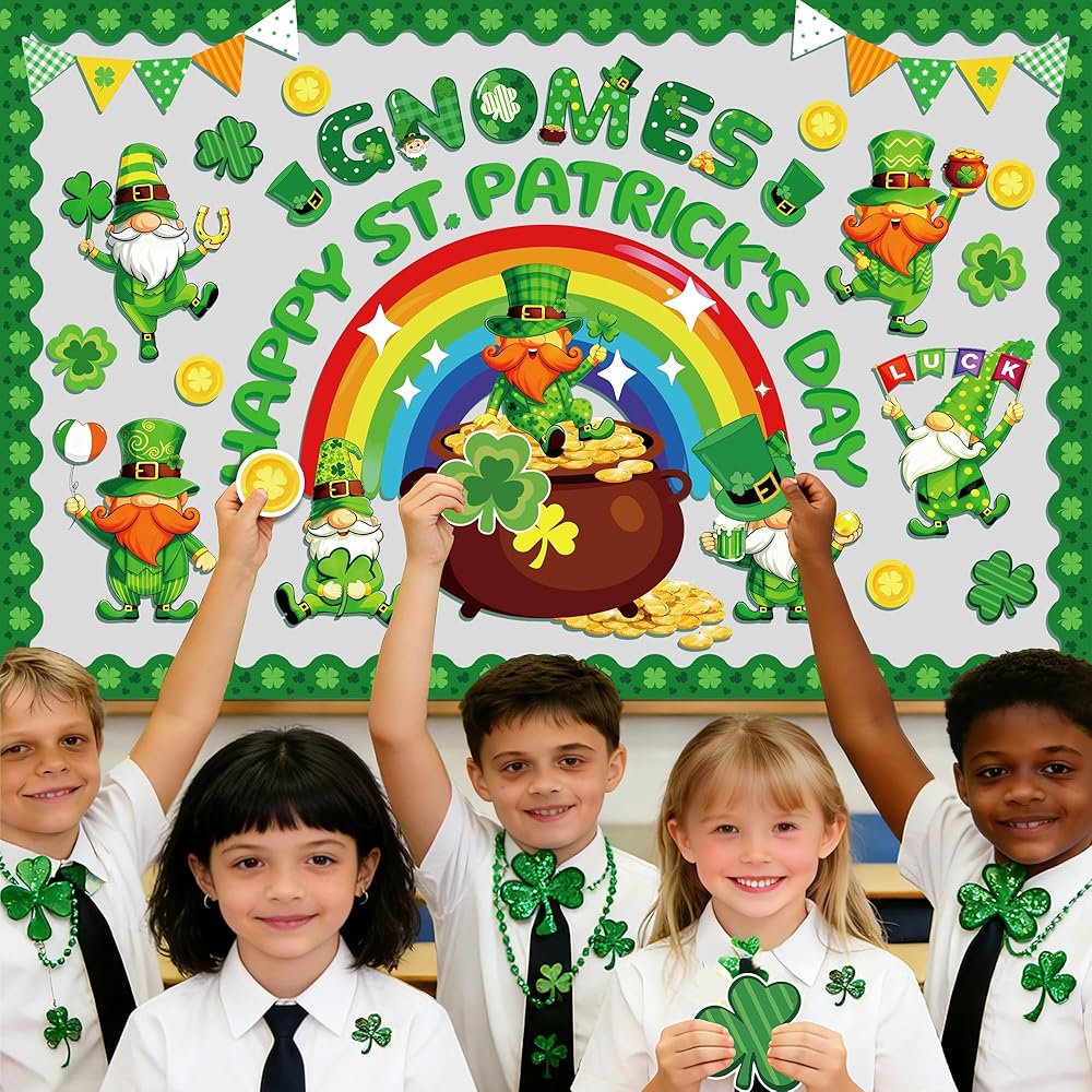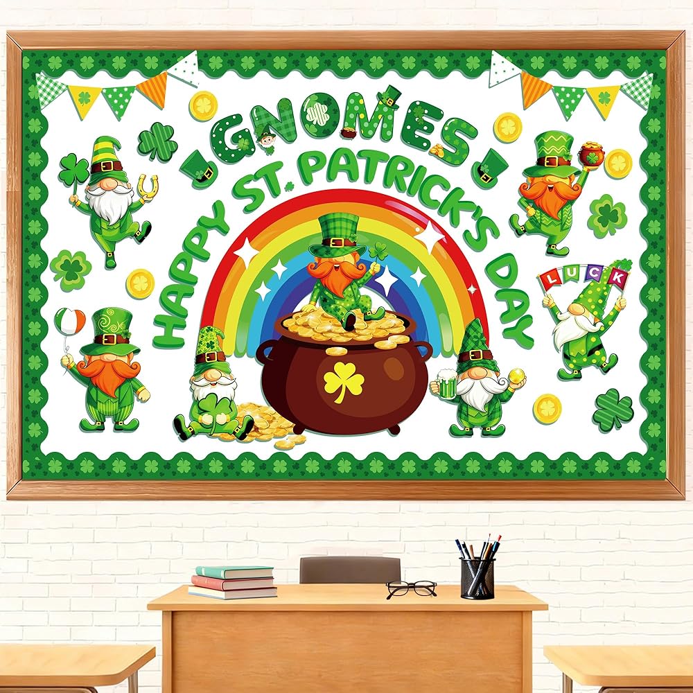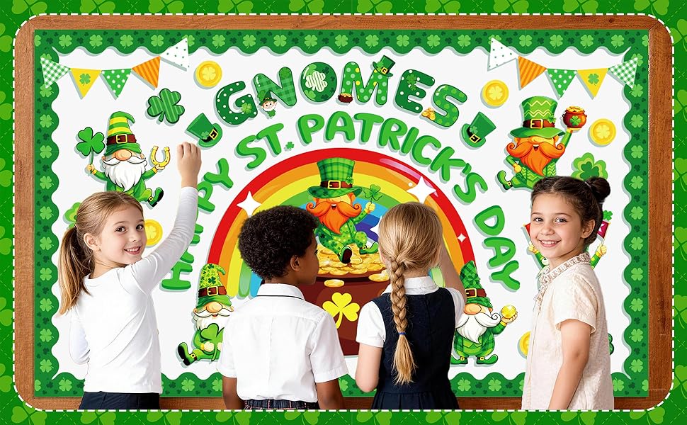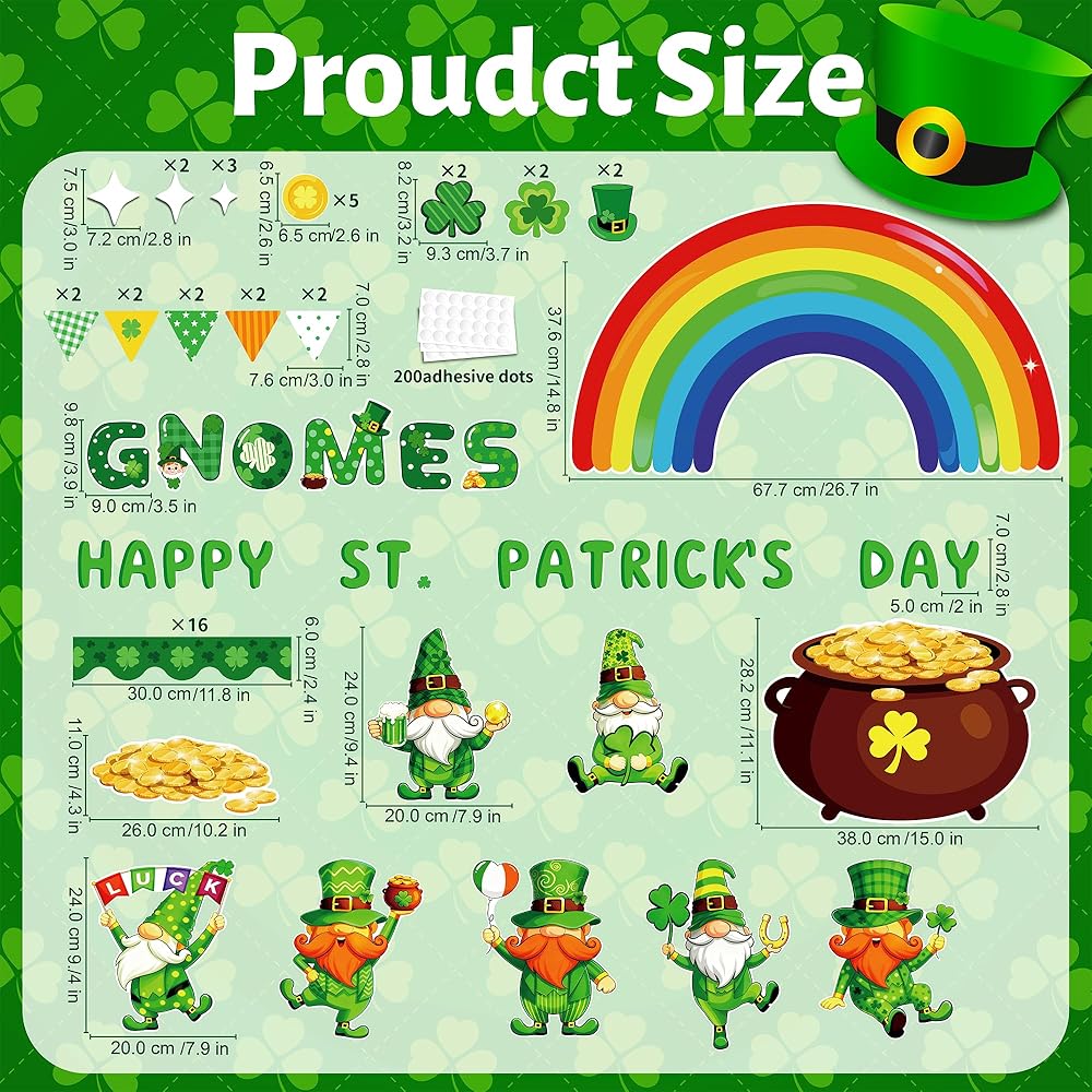 تصميم ممتاز: شارعنا. تتميز لوحة إعلانات يوم باتريك بموضوع القديس باتريك جنوم الذي يضم العديد من القديس باتريك. عناصر يوم باتريك، والأقزام اللطيفة، والعملات الذهبية، وقوس قزح، والبرسيم المحظوظ، ووعاء الذهب ونفل النفل ستضفي جوًا مبهجًا لحفلة القديس باتريك، و"التماثيل" "يوم القديس باتريك السعيد" ستجعل الطلاب يهتفون ويضحكون
