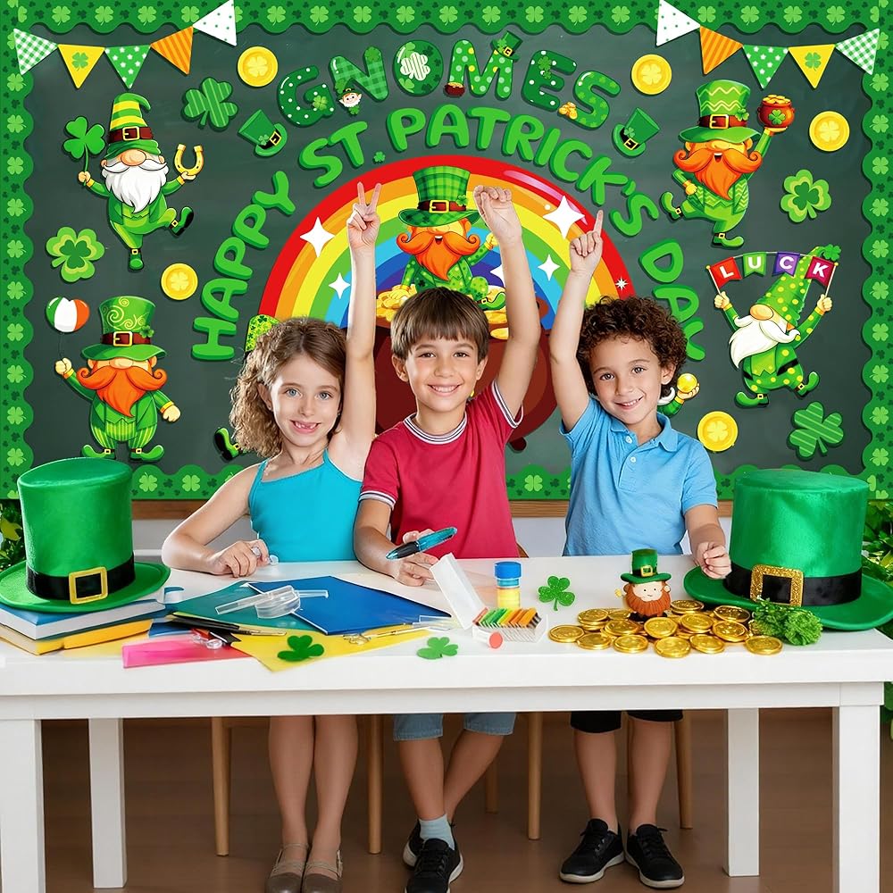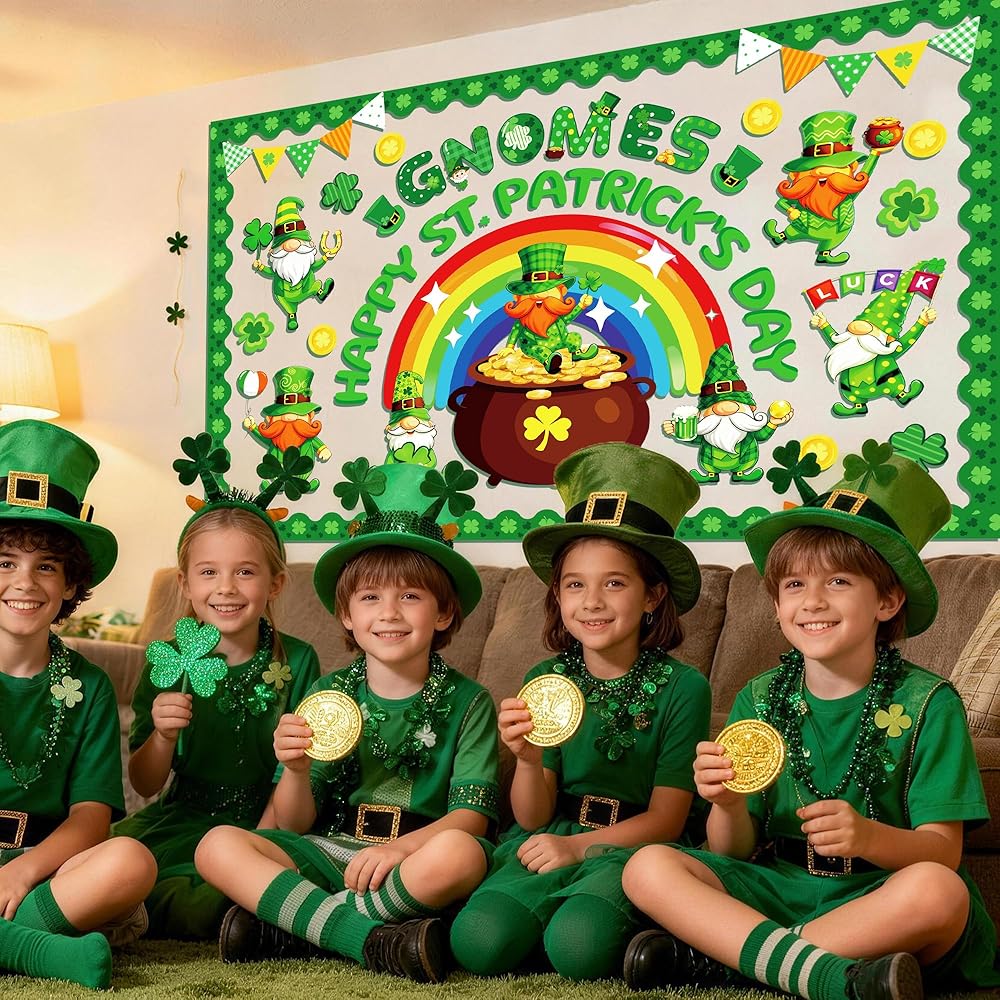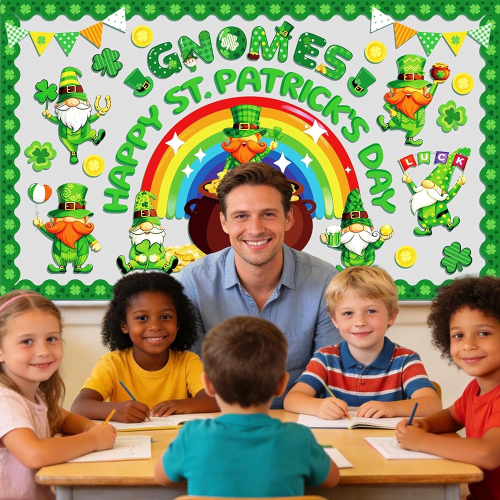 تصميم ممتاز: شارعنا. تتميز لوحة إعلانات يوم باتريك بموضوع القديس باتريك جنوم الذي يضم العديد من القديس باتريك. عناصر يوم باتريك، والأقزام اللطيفة، والعملات الذهبية، وقوس قزح، والبرسيم المحظوظ، ووعاء الذهب ونفل النفل ستضفي جوًا مبهجًا لحفلة القديس باتريك، و"التماثيل" "يوم القديس باتريك السعيد" ستجعل الطلاب يهتفون ويضحكون
