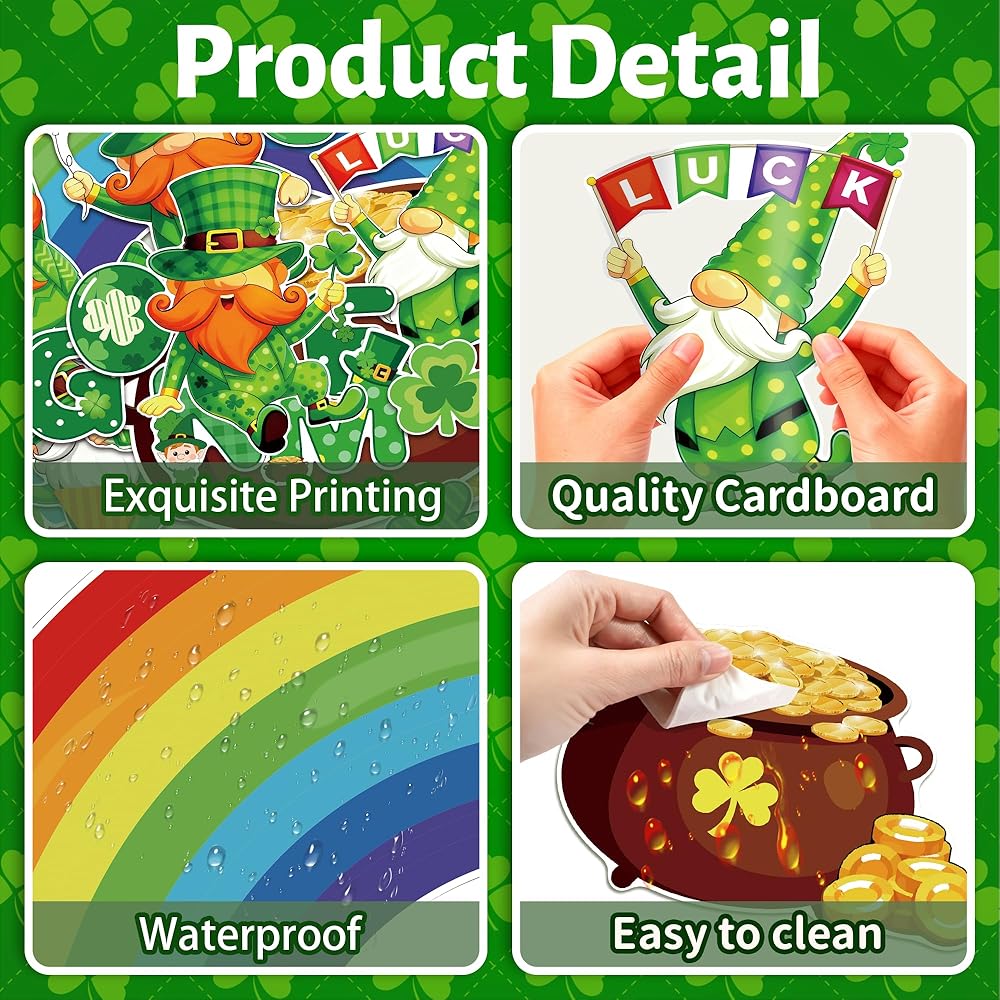 مادة فاخرة: قطع ديكورات الفصل الدراسي في عيد القديس باتريك مصنوعة من ورق عالي الجودة، وهو قوي ومتين ولا يسهل تمزيقه وطباعته بشكل واضح، مجموعة ديكورات لوحة إعلانات القديس باتريك مغطاة بطبقة من الفيلم اللامع على السطح، مما يجعلها مقاومة للماء وذات ألوان زاهية، مما يجعل ديكورات عيد القديس باتريك الخاصة بك لافتة للنظر