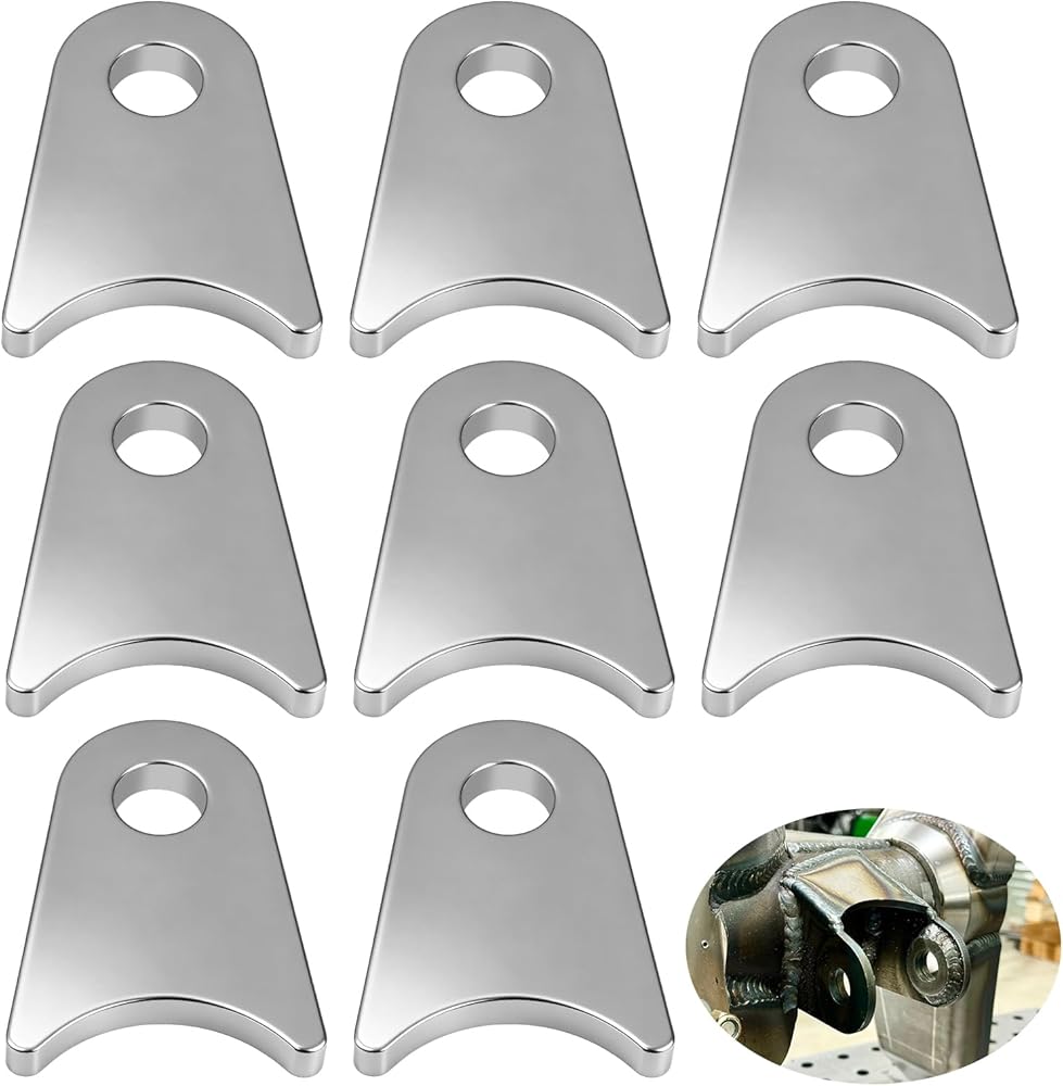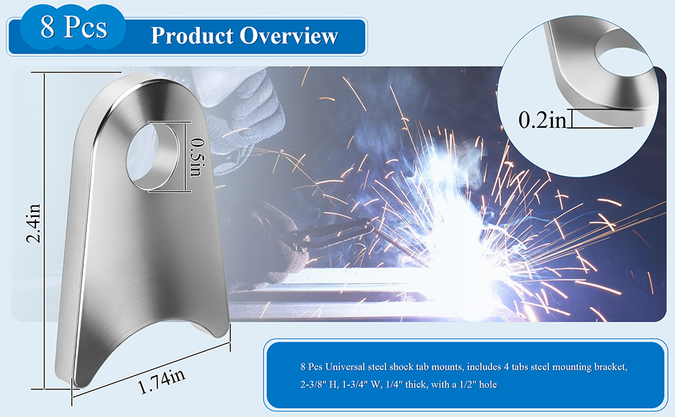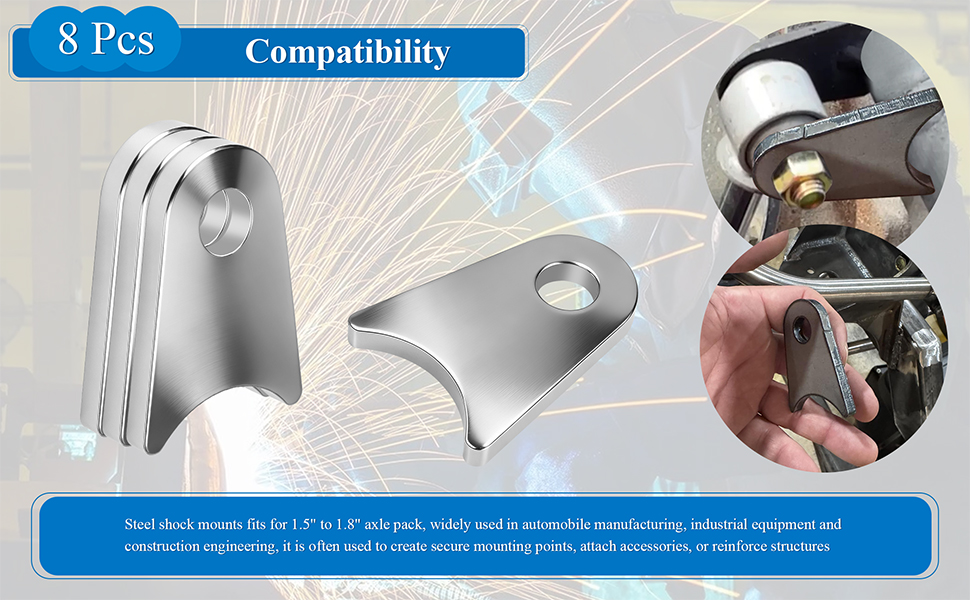 8 قطع ملحومة على علامات التبويب، حوامل عروة الصدمات الفولاذية، تناسب حزمة المحور من 1.5 بوصة إلى 1.8 بوصة، ارتفاع 2-3/8 بوصة، عرض 1-3/4 بوصة، سماكة 1/4 بوصة، دعامات تثبيت فولاذية شديدة التحمل، لحام عالمي على حامل محور علامات التبويب، مع فتحة 1/2 بوصة