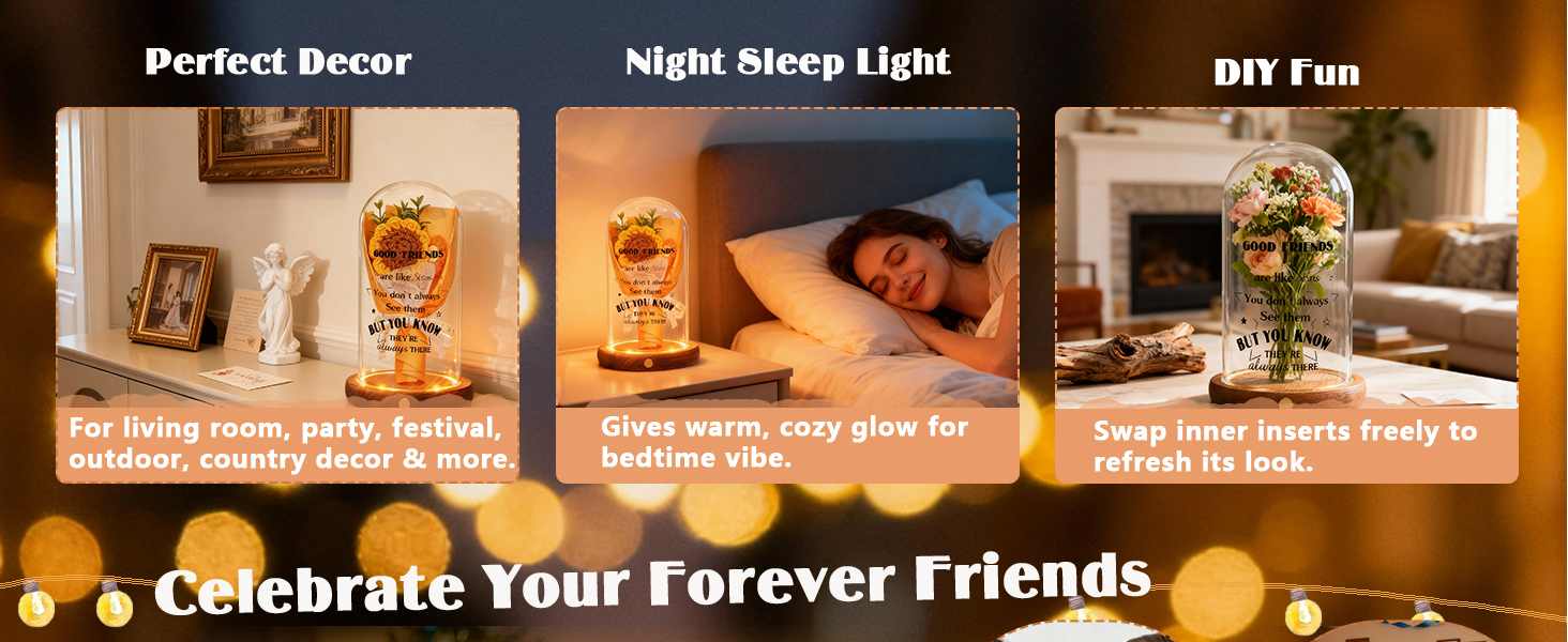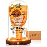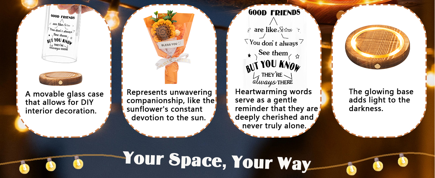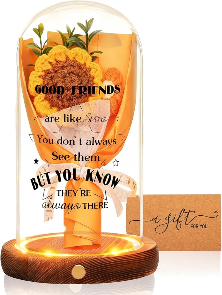 برطمان الصداقة - الأصدقاء الجيدون مثل هدايا النجوم: تم تصميم هذه الجرة الزجاجية على شكل جرس مع قاعدة خشبية لتدوم. الاقتباس المنقوش "الأصدقاء الجيدون مثل النجوم..." بمثابة تذكير لطيف: الأصدقاء الحقيقيون يضيءون حياتنا حتى من بعيد. داخل الزجاج الشفاف، باقة عباد الشمس الكروشيه النابضة بالحياة لا تذبل أبدًا، مما يرمز إلى الفرح المستمر لصداقتك. مقترنة بقاعدة خشبية متينة تتوهج بهدوء مع مصابيح LED، فهي تضيف الدفء المريح إلى المنضدة أو الرف أو المكتب.