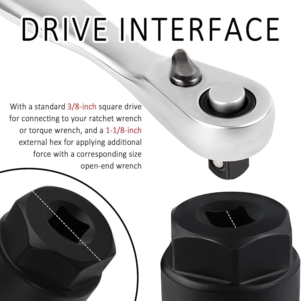 Drive Interface: The automotive 1-1/16 socket features a dual-interface design with a standard 3/8-inch square drive for connecting to your ratchet wrench or torque wrench, and a 1-1/8-inch external hex for applying additional force with a corresponding size open-end wrench