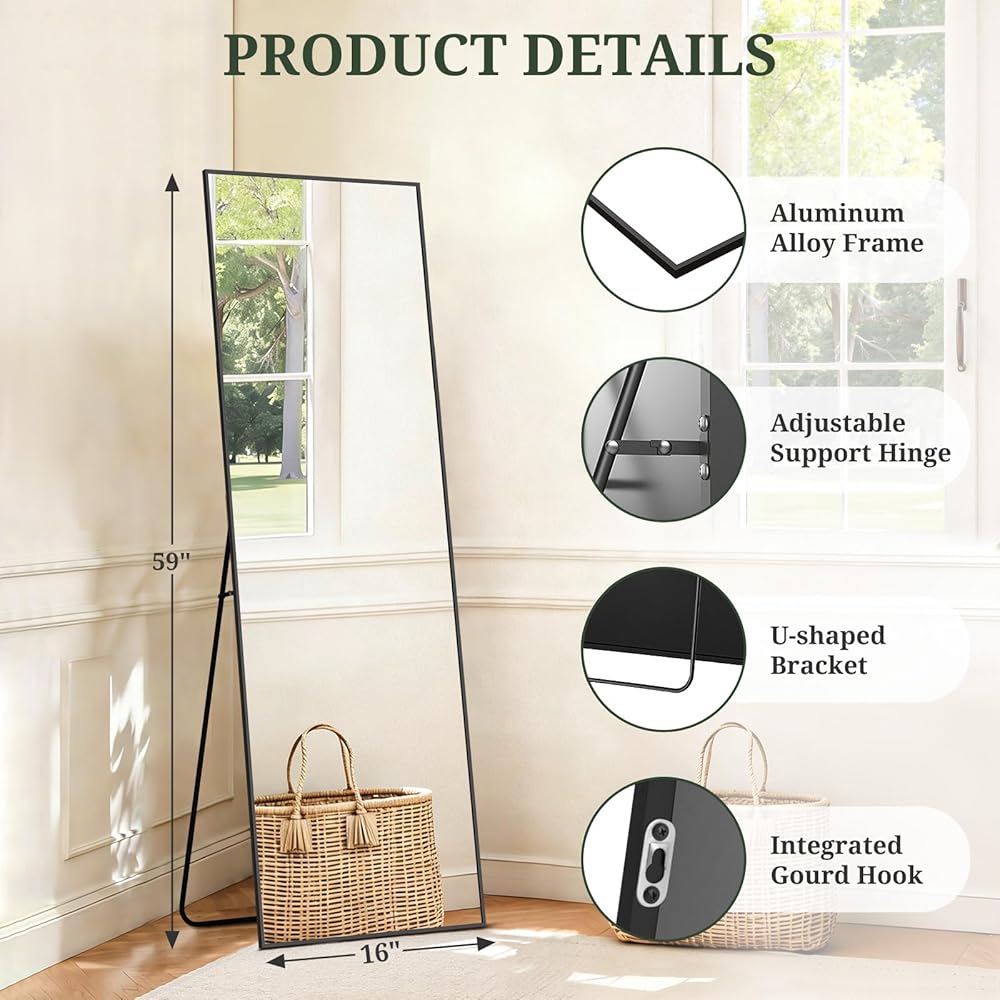 مرآة كاملة الطول 59 بوصة × 16 بوصة مرآة أرضية لكامل الجسم مع حامل، زجاج مقاوم للكسر، إطار من سبائك الألومنيوم، مرايا مستطيلة قائمة بذاتها مثبتة على الحائط أو مائلة لغرفة النوم ومدخل غرفة المعيشة