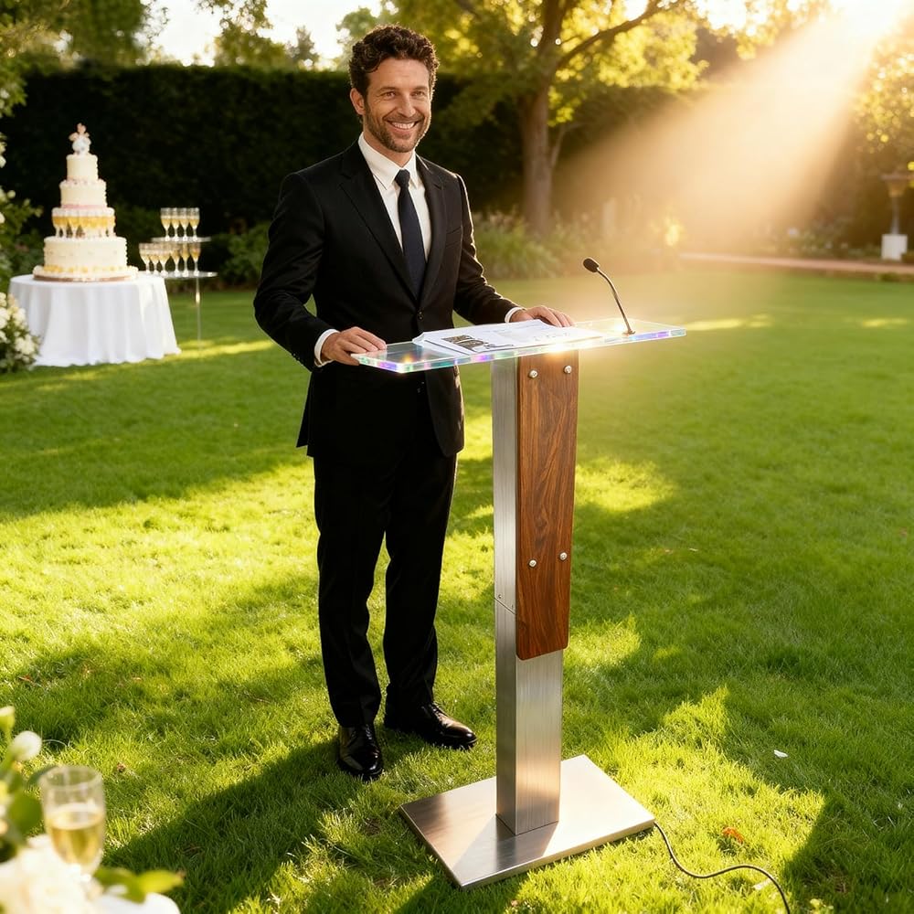 حامل منصة من الفولاذ المقاوم للصدأ مع سطح قراءة أكريليك ومدخل كابل مخفي، حامل منصة احترافي حديث مع زخرفة خشبية للكنيسة، حامل منصة للكنيسة والمؤتمرات والخطاب والزفاف