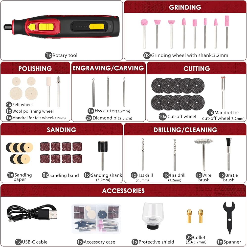 【الكل في واحد مع 53 ملحقًا】- أداة صغيرة واحدة لأغراض متعددة! تأتي هذه الأداة الدوارة مع 53 ملحقًا وهي مثالية لمجموعة متنوعة من الأعمال اليدوية الخفيفة. بالنسبة للطحن والتلميع والتقويس والصنفرة والنقش والمزيد من المشاريع الخفيفة، كل ما تحتاجه هو هذه الأداة المريحة المتكاملة.