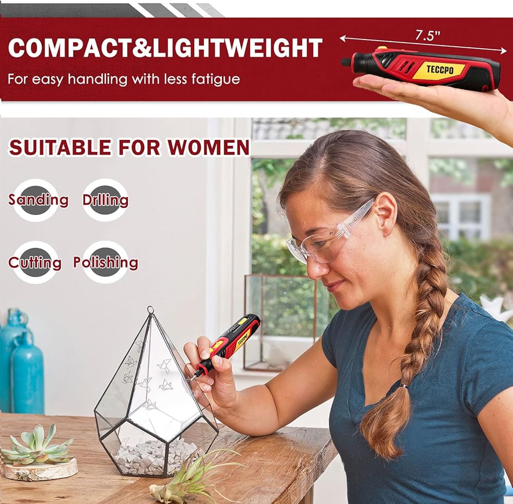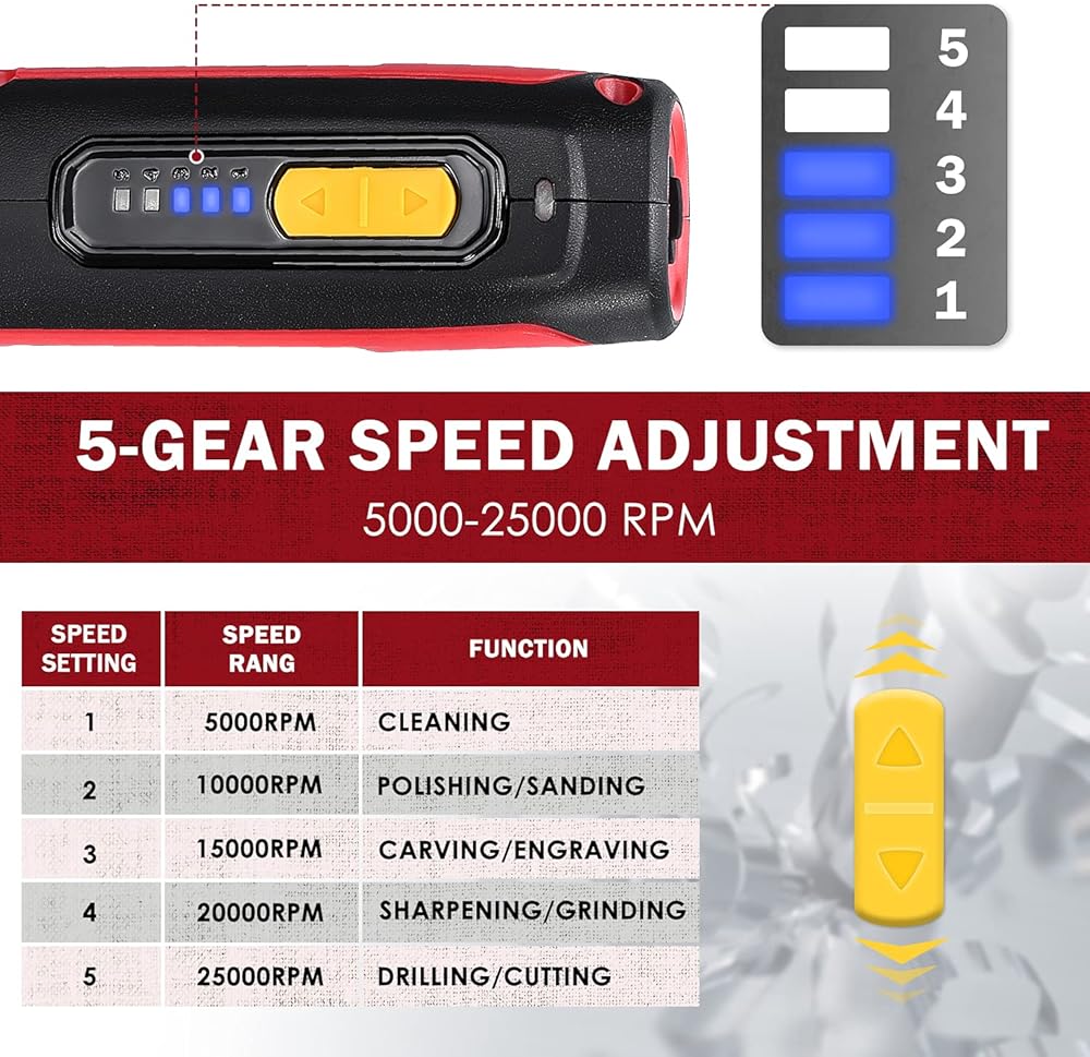 【5 سرعات قابلة للتعديل】- يمكن للأداة الدوارة اللاسلكية TECCPO تحقيق 5 سرعات متغيرة (5000/10000/15000/20000/25000 دورة في الدقيقة)، فهي تسمح لك بتعديل سرعة التلميع والتحكم فيها بدقة لتلبية قوة السيناريوهات المختلفة، مما يجعل عملك الفني إنشاء DIY أمر سهل للغاية. مع مواد مختلفة مثل الخشب والمعادن الناعمة والبلاستيك والحجر، فإن الإبداع المعجزة أصبح بين يديك!
