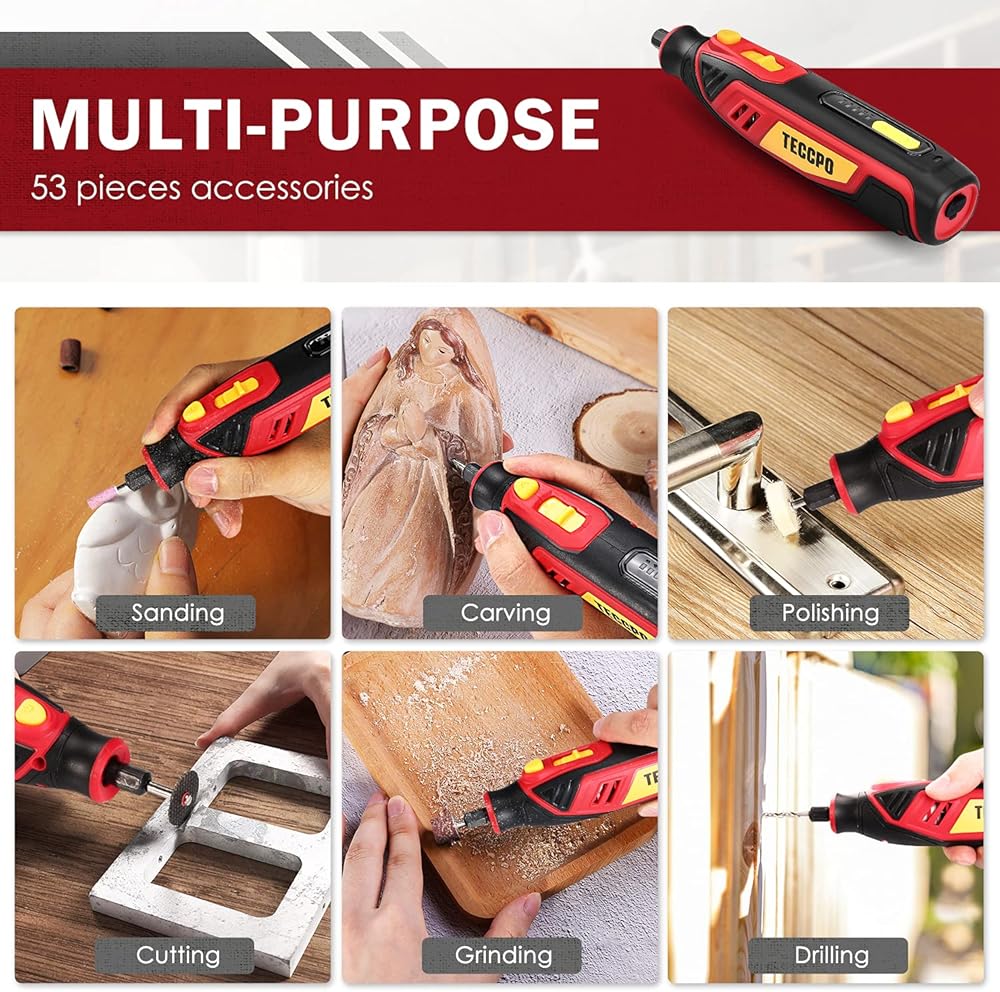 【محتويات المجموعة】أداة TECCPO الدوارة هي الحل الأمثل لمهام تحسين المنزل الصغيرة والمشروعات اليدوية. تأتي مجموعة الأدوات الدوارة مع: 1 × أداة دوارة TECCPO 4V، 53 ملحقًا، 1 × كابل USB-C، 1 × درع واقي، 1 × دليل المستخدم.