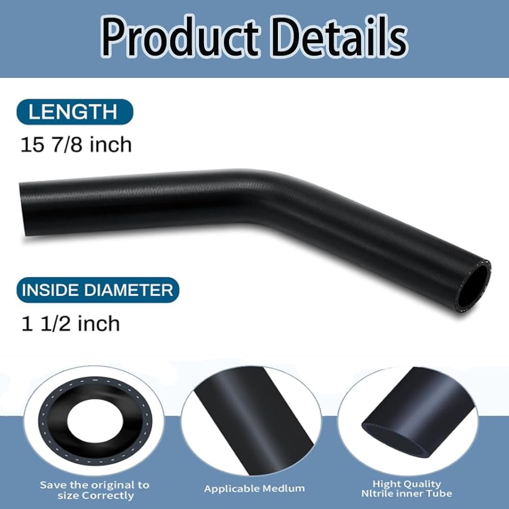 45° Gasoline Fuel Filler Neck Hose 24710 Suitable for Gasoline, Methanol, Gasohol Blends of Ethanol, Ethers, Diesel and Biodiesel to B20. Specification: 1 1/2 Inside Diameter; 15 7/8 Long Size; 45 Degree Bend