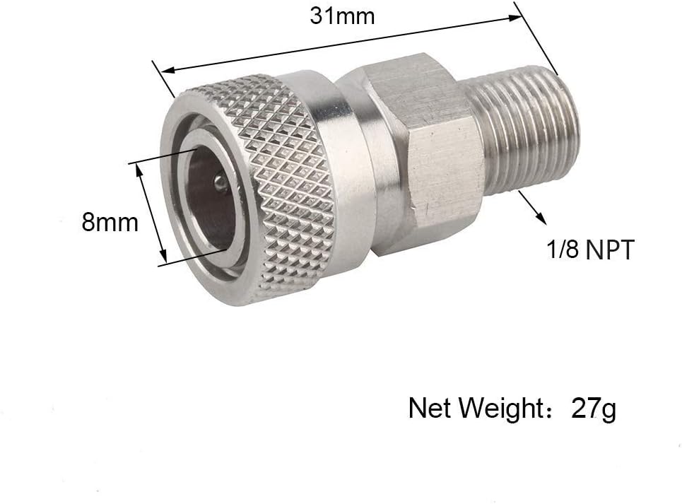 - المقاس: قابس أنثى 8 ملم، خيط ذكر داخلي ان بي تي 1/8 انش، طول 30.5 ملم/1.2 انش.