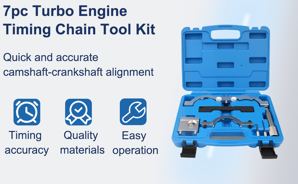 سهلة الاستخدام: تعمل مجموعات أدوات التوقيت العالمية هذه على تبسيط إجراءات صيانة نظام التوقيت، وتسمح بمحاذاة دقيقة لعمود الكامات والعمود المرفقي، وتقلل من مدة الإصلاح والاستبدال، وتلبي متطلبات صيانة توقيت المحرك المختلفة.
