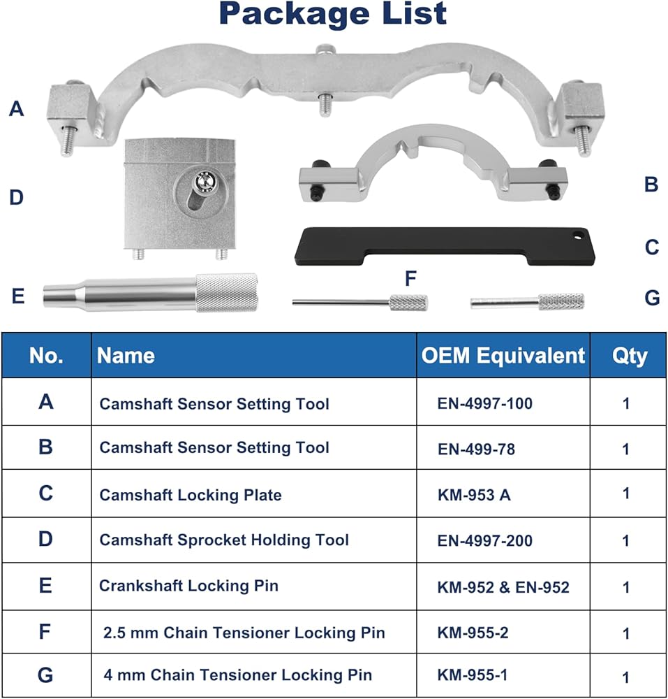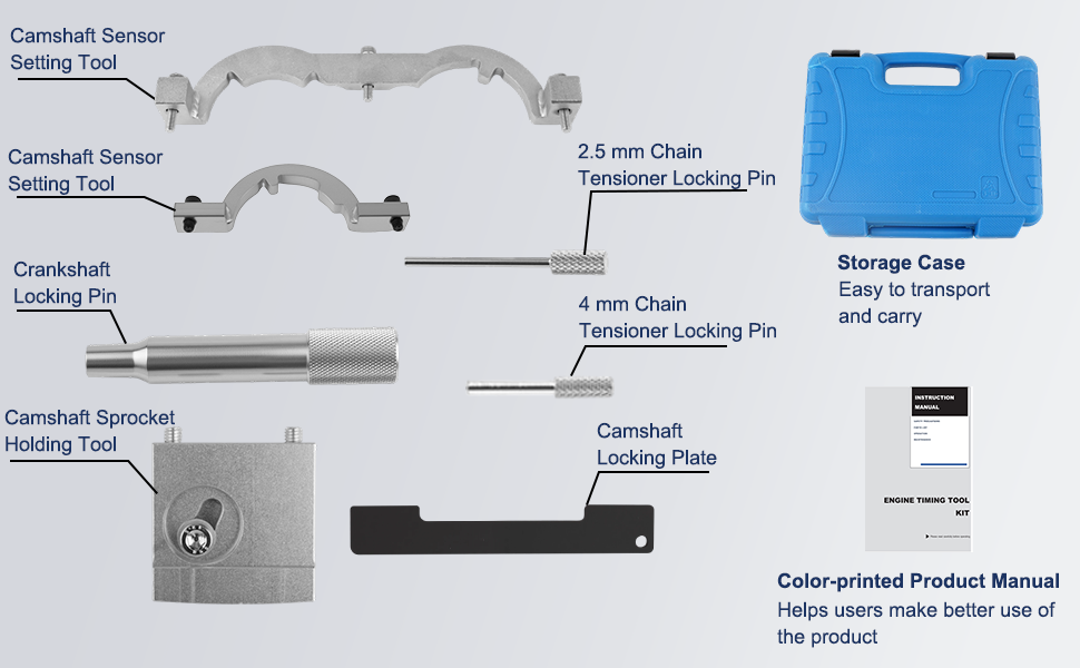 أجزاء العبوة الكاملة: تأتي مع لوحة قفل عمود الحدبات، ودبوس قفل العمود المرفقي، وأداتين لإعداد مستشعر عمود الحدبات، وأداة تثبيت ضرس عمود الحدبات، ودبابيس قفل شداد السلسلة، وحقيبة تخزين محمولة ودليل المستخدم؛ يفي بجميع المتطلبات التشغيلية لأعمال صيانة نظام التوقيت