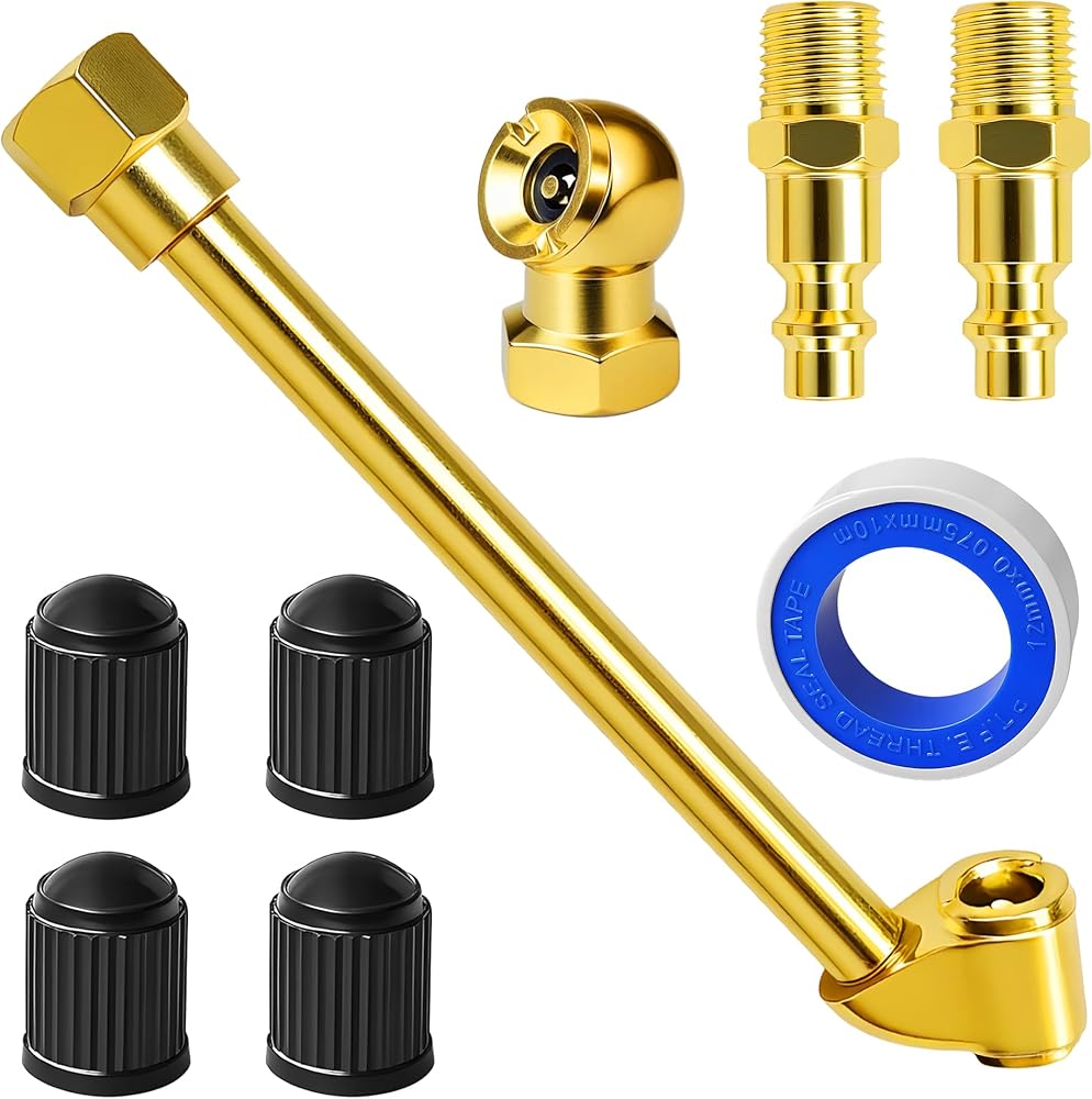This versatile tire inflation kit comes with everything you need to quickly and efficiently inflate tires on a wide range of vehicles, from bicycles to cars, trucks, and motorcycles. The set includes a dual head closed flow air chuck, a ball head air chuck, two male quick plugs, a roll of Teflon tape, and four valve caps. Both air chucks feature a closed flow design that prevents air leakage, ensuring that air only flows when the chuck is engaged with the valve core. Whether for business or household use, this durable and easy-to-use set is an excellent choice for all your tire inflation needs