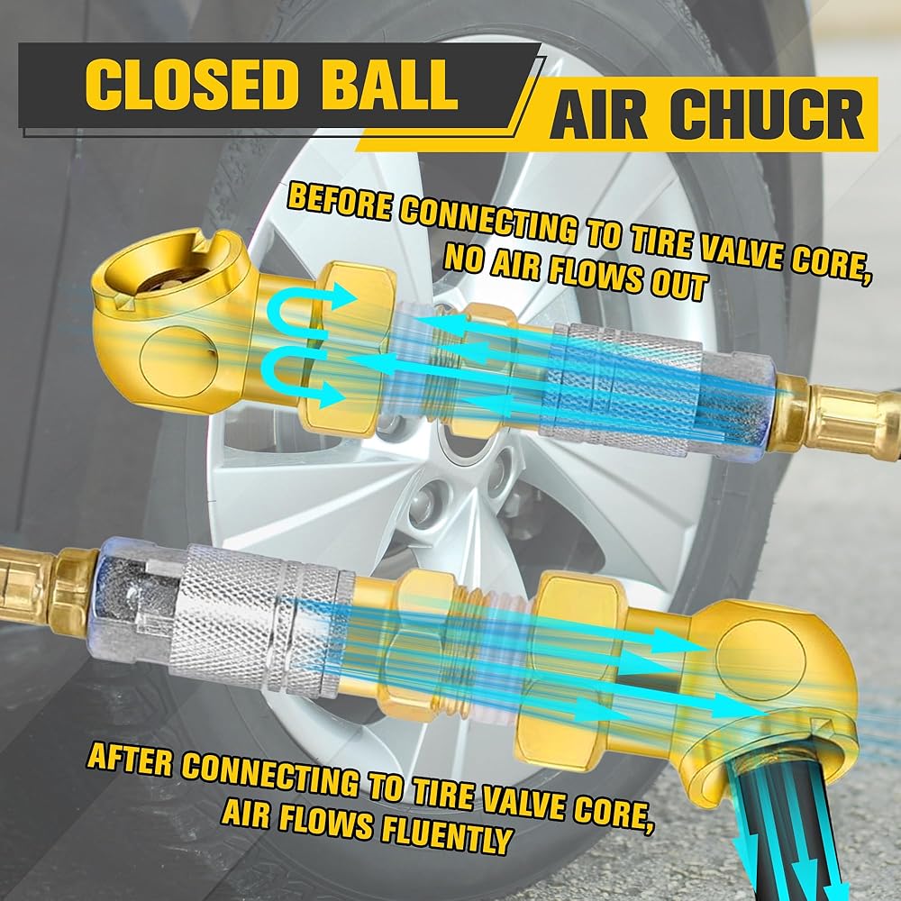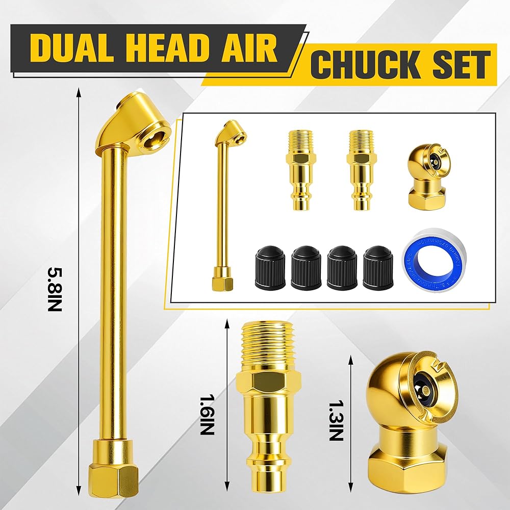 Comprehensive Tire Inflation Kit: Includes a dual head closed flow air chuck, a ball head air chuck, male quick plugs, Teflon tape, and valve caps—everything you need to inflate Schrader valves on bikes, motorcycles, cars, trucks, and more