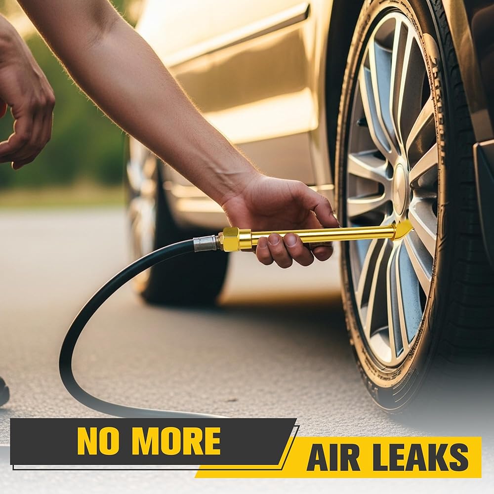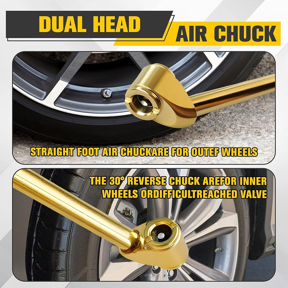 Dual Head Air Chuck for Hard-to-Reach Valves: The 2-in-1 dual head closed flow air chuck features an extended metal alloy air rod, allowing easy inflation even in awkwardly located tire valves. The push/pull operation ensures quick and efficient inflation without air leakage