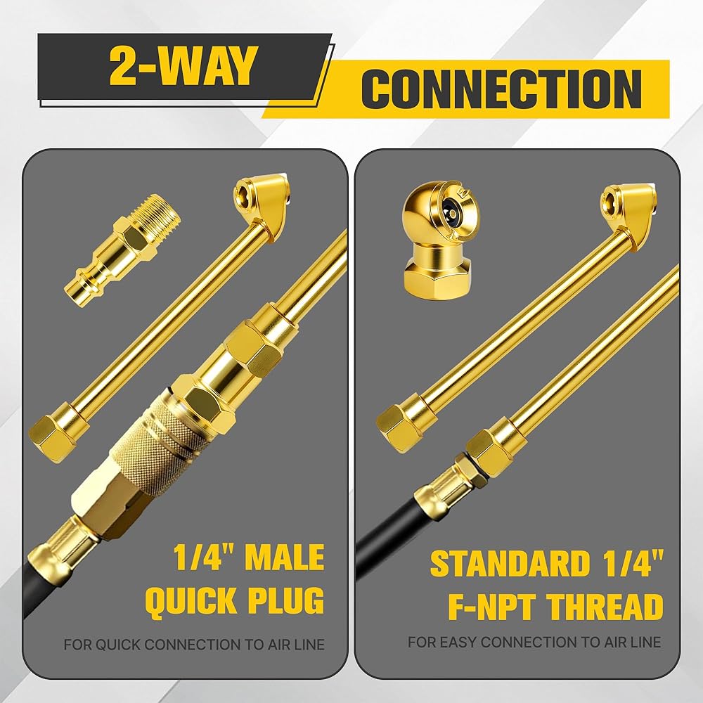 Easy and Secure Connection: Both air chucks come with a 1/4" female NPT thread, making them easy to connect to air lines, compressors, or tire inflator gauges for smooth and secure inflation. The included male quick plug ensures swift connection to air lines