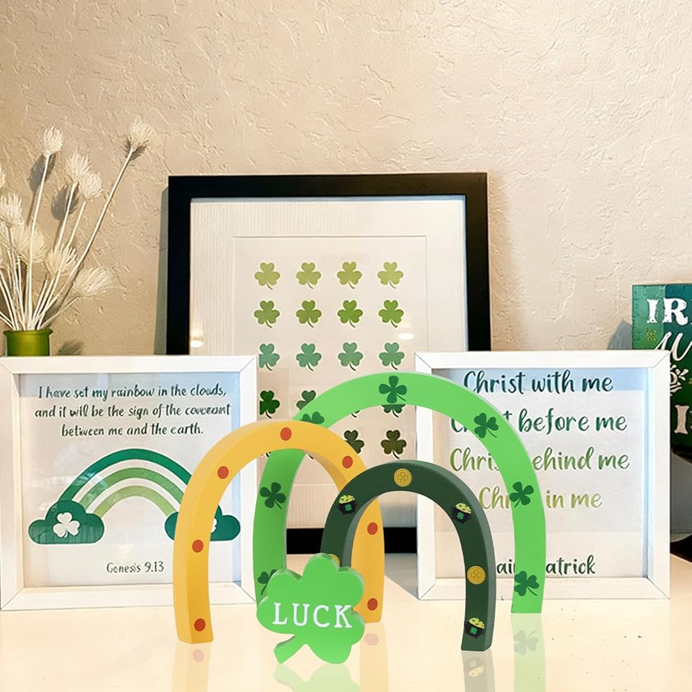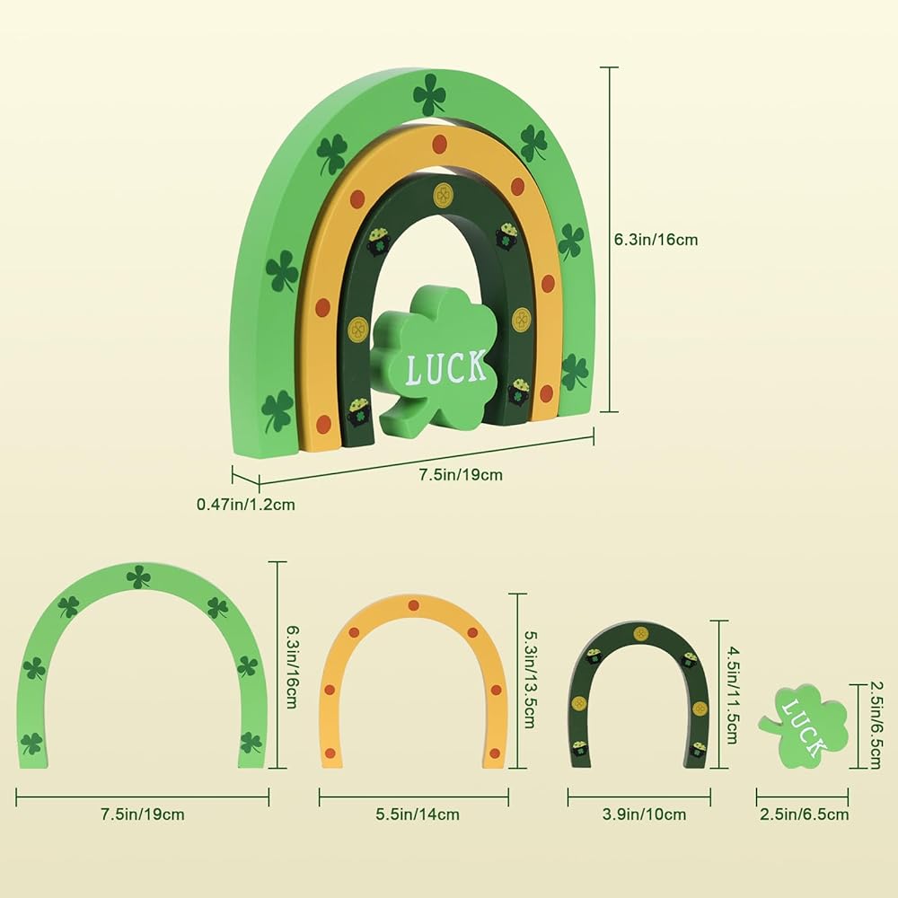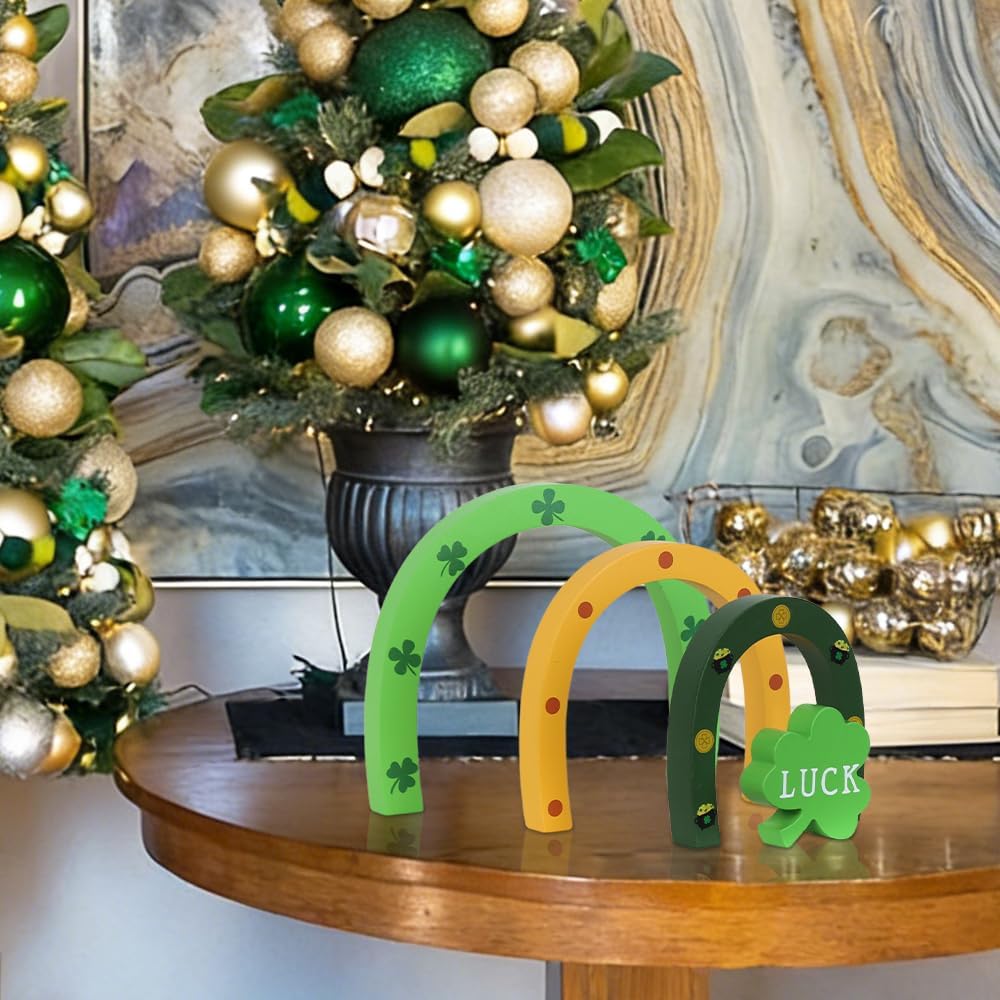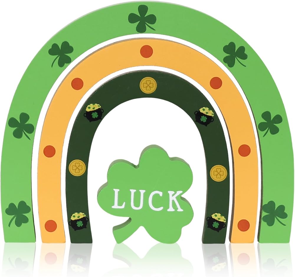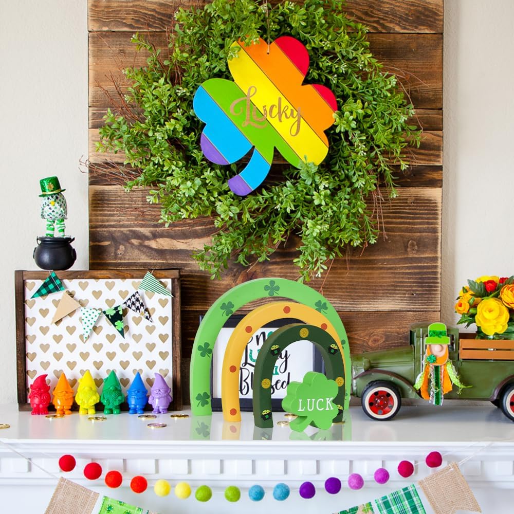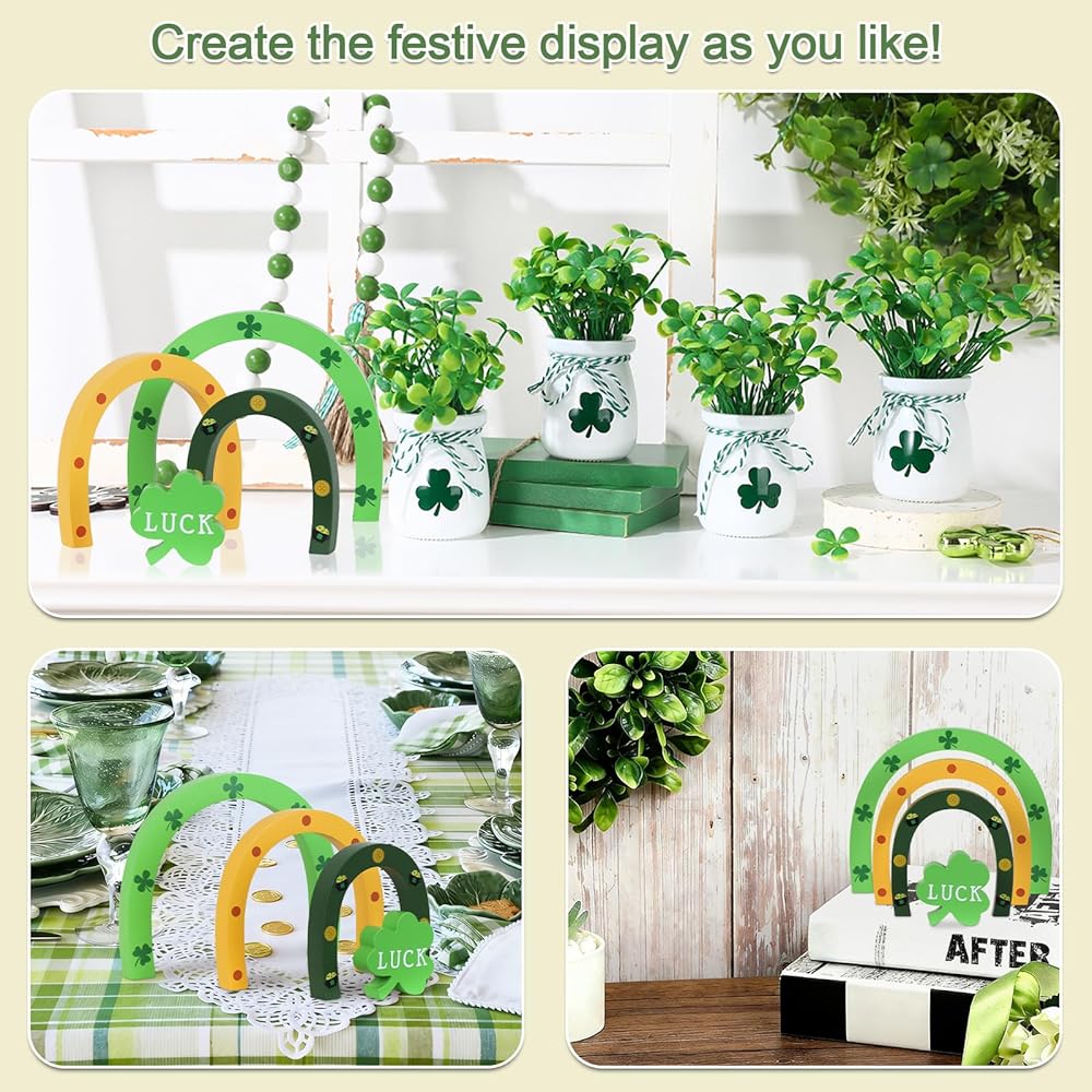 🌈【ديكورات يوم القديس باتريك】تتميز مجموعة ديكور يوم القديس باتريك من DECSPAS بثلاث قطع خشبية مقوسة مستقلة مزينة بنبات النفل الكلاسيكي، وحدوة حصان ذهبية، ووعاء من الذهب، جنبًا إلى جنب مع كتلة نبات النفل "LUCK" المستقلة. قم بترتيبها بحرية في شاشة عرض قوس قزح متعددة الطبقات أو قم بفصلها لترتيبات متنوعة - مما يضيف لمسة من السحر التفاعلي والمرونة الإبداعية إلى ديكور عيد القديس باتريك الخاص بك.