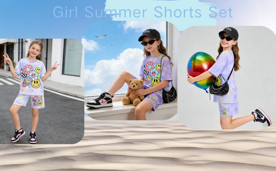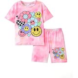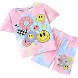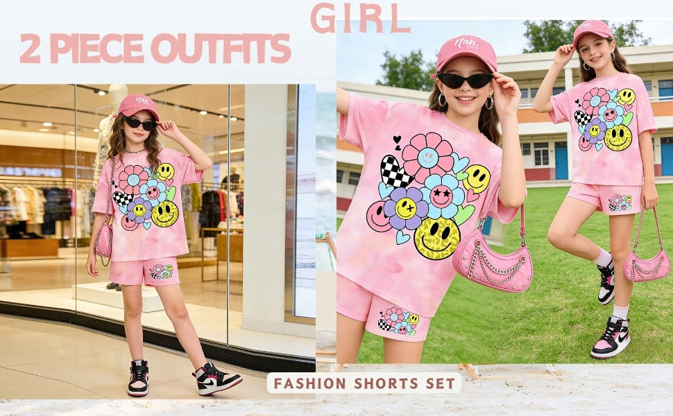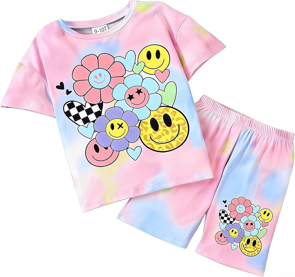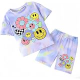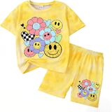 التصميم: تتميز مجموعة ملابس الفتيات هذه بقماش ناعم مصبوغ بألوان فاتحة مع وجه مبتسم لطيف وأنماط زهور، مثالية للارتداء اليومي العصري للأطفال