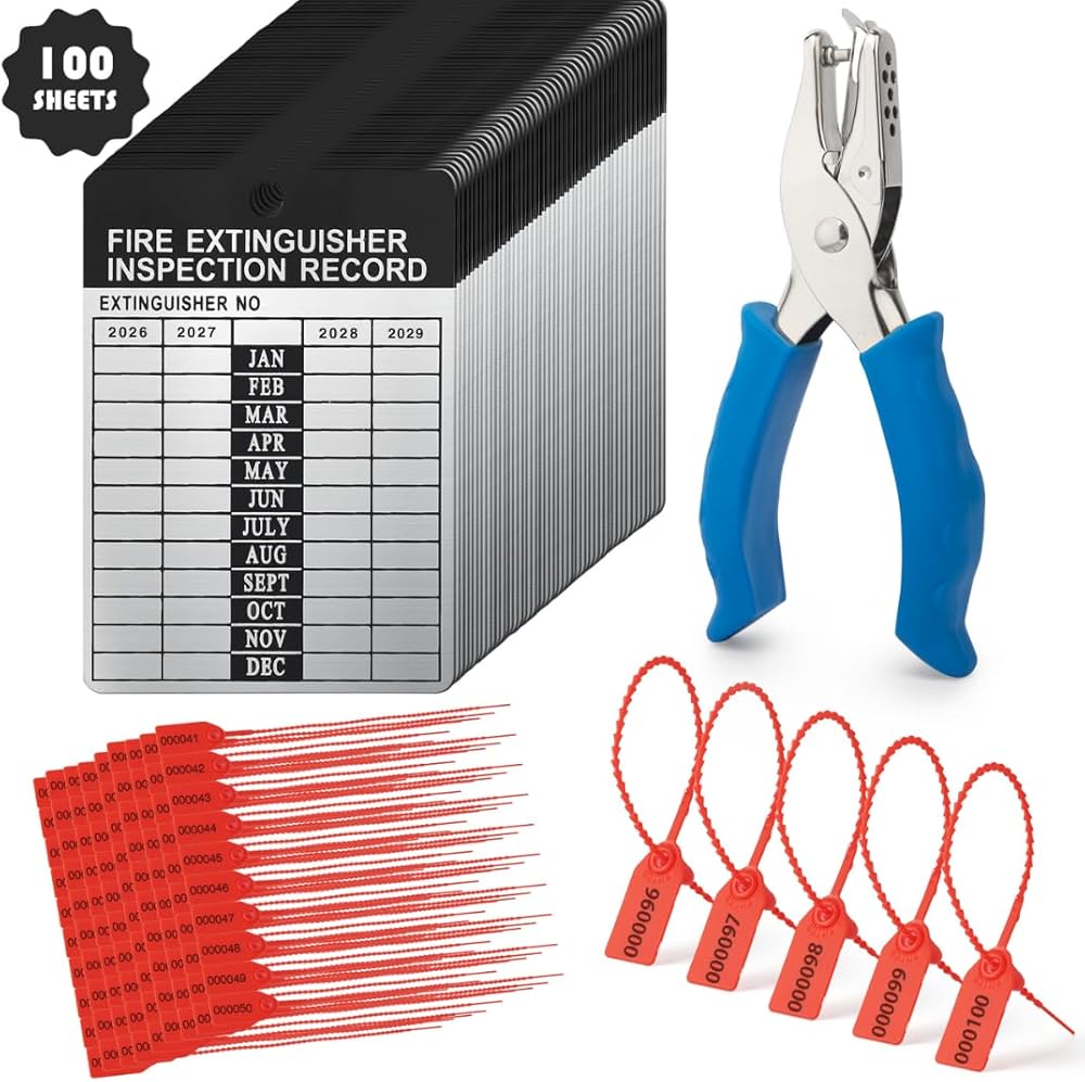 ملاحظة مهمة ومحتويات العبوة: سطح المنتج مغطى بطبقة واقية. يرجى إزالة الفيلم قبل الاستخدام لضمان كتابة واضحة. تشمل العبوة: 25 بطاقة فحص طفاية حريق من الألومنيوم، و25 ربطة عنق بسحاب أمان مرقمة، و1 مثقاب ثقب محمول باليد.