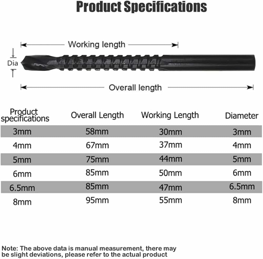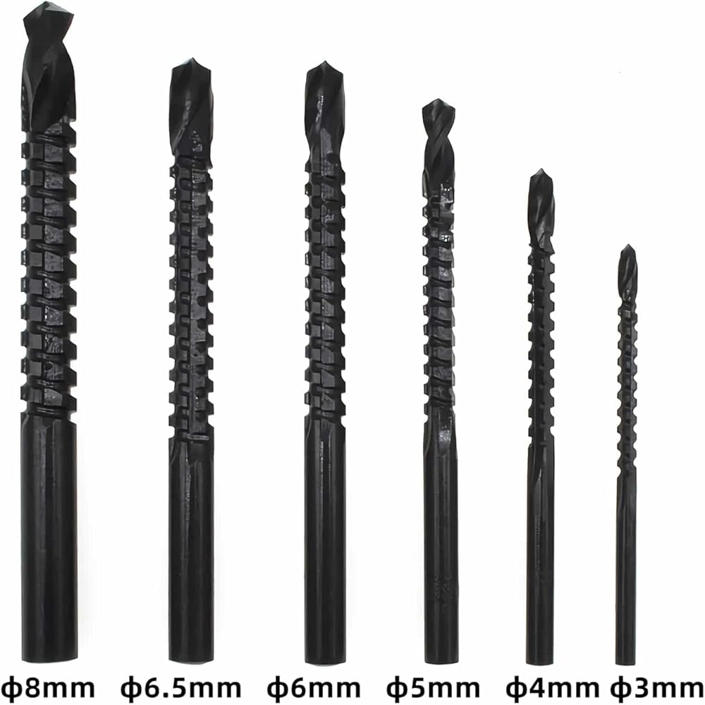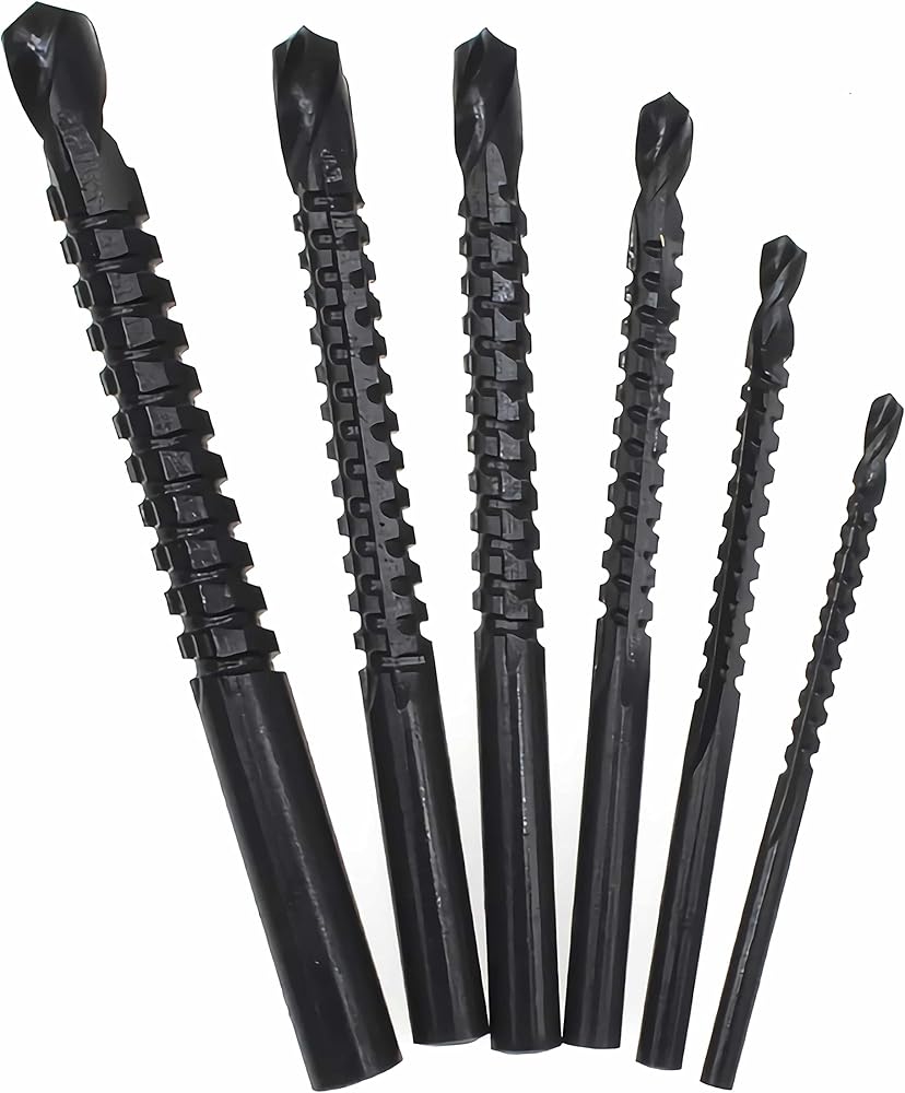 6 sets of titanium HSS 4241 bits, 3mm, 4mm, 5mm, 6mm, 6.5mm, 8mm, which can meet your daily need. Fits most of power drill.