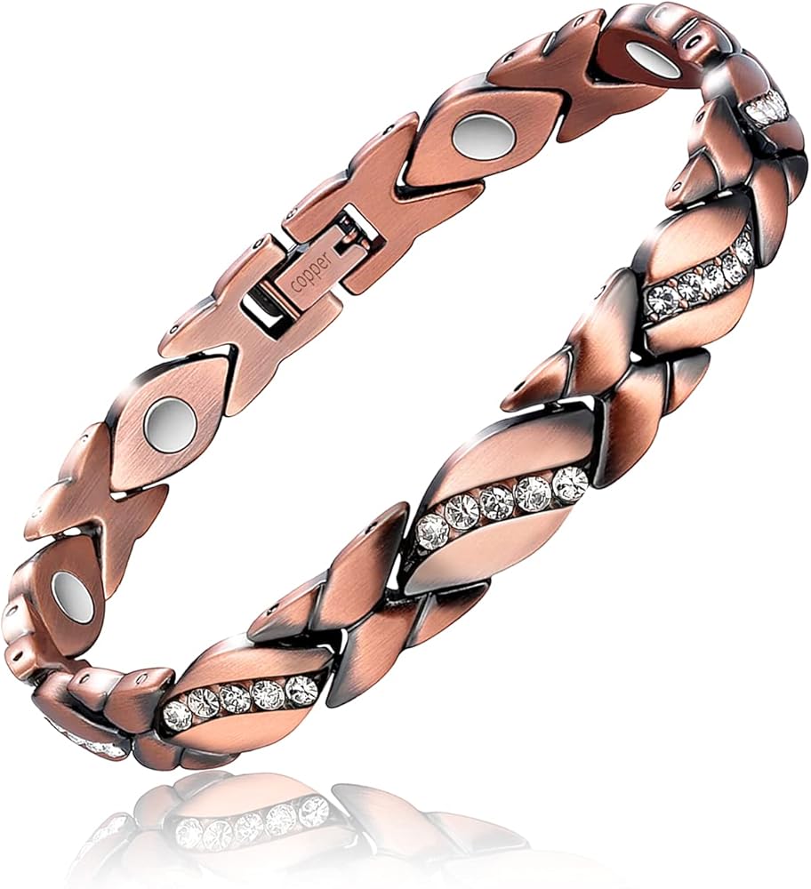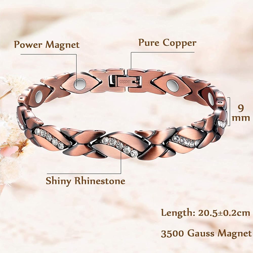 • Copper Bracelet for Women: This copper link bracelet is made of 99.99 percent solid copper, Fine polishing, lead-free nickel-free. The copper magnetic bracelet is coated with a protective film and it will not oxidize or turn green easily, Scratches Resistant.