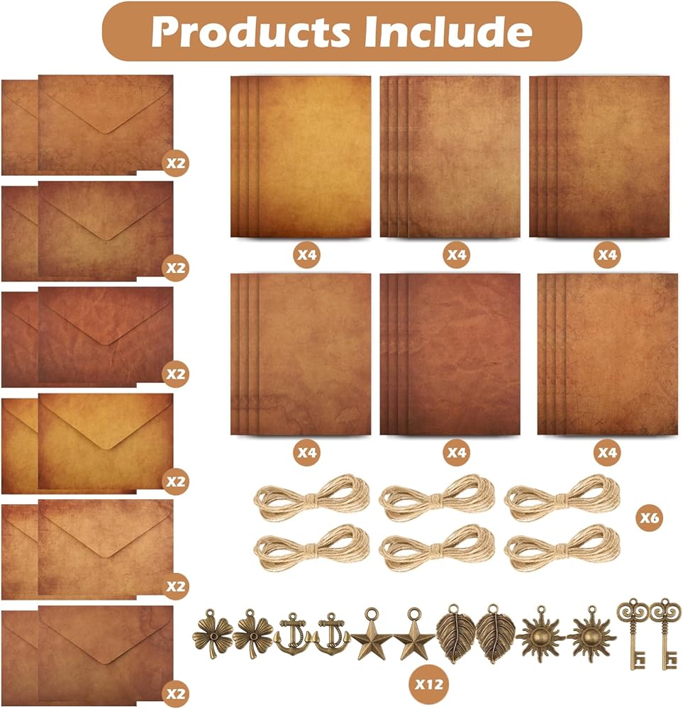 This all-in-one bundle features 6 complete stationary letter and envelopes kits, each with 4 sheets of premium vintage paper, 2 decorative vintage envelopes, 2 twines and 2 classic key metal accessories. You'll have plenty of stationary for all your writing needs, no need to restock anytime soon.