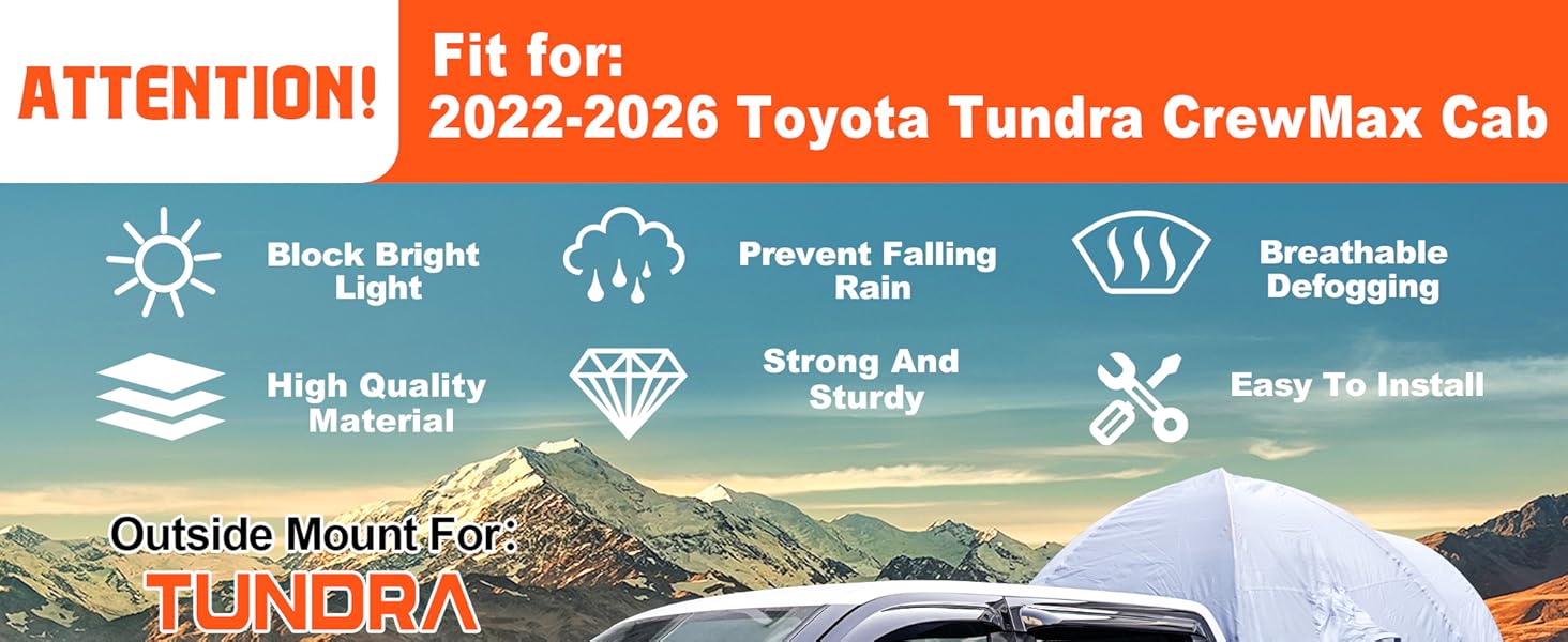 انتباه! تحقق من طراز سيارتك وعامها قبل الشراء. تم تصميم واقيات المطر الكبيرة السميكة من APILT لسيارة Tundra CrewMax Cab لعام 2022، و2023 Tundra CrewMax Cab، و2024 Tundra CrewMax Cab، و2025 Tundra CrewMax Cab، و2026 Tundra CrewMax Cab.