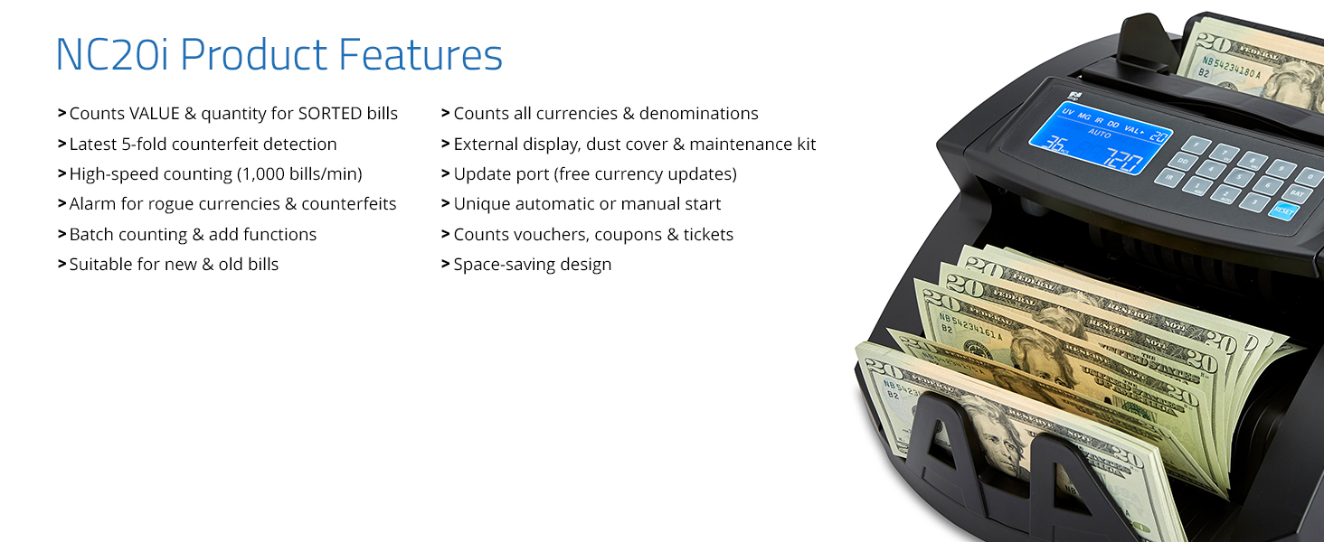 • يكتشف NC20i غالبية الأوراق النقدية المزيفة. ومع ذلك، تتطلب المنتجات المزيفة المتقدمة آلات ذات مواصفات أعلى. للحصول على أقصى قدر من الحماية، راجع موديلات NC55 أو NC60 أو NC70
