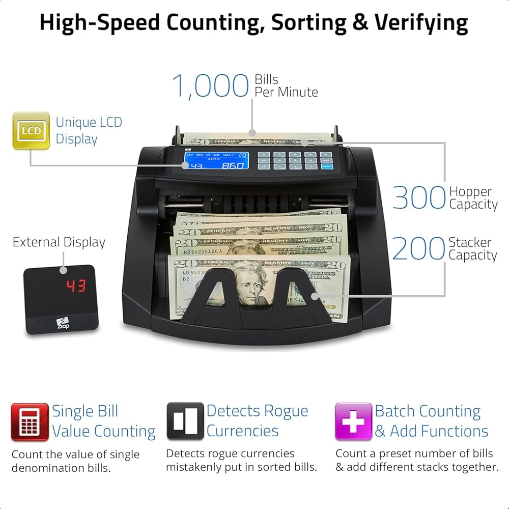• أحدث طراز / ملاحظة: أدخل الفئة التي تقوم بحسابها / مناسبة لكميات النقد الصغيرة / بالنسبة للأحجام الكبيرة، تحتاج إلى محمل علوي، على سبيل المثال. ZZap NC25 / ملاحظة: قم بمحاذاة الفواتير، وتسوية الفواتير المطوية ووضعها في وسط القادوس / ضمان لمدة عام مع فني داخلي / دعم مباشر أثناء وبعد الضمان / ZZap هو بائع معتمد في اختبارات البنك المركزي