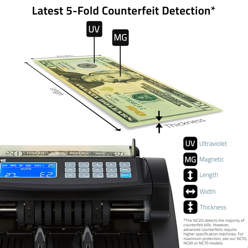 • أحدث اكتشاف للتزييف بخمسة أضعاف (على عكس الطرز الأخرى، فإنه يستخدم الأشعة فوق البنفسجية، MG، L، W، T) - إذا تم اكتشاف منتج مزيف، فإنه يتوقف تلقائيًا عن العد وينبهك بتحذير مرئي وصوتي