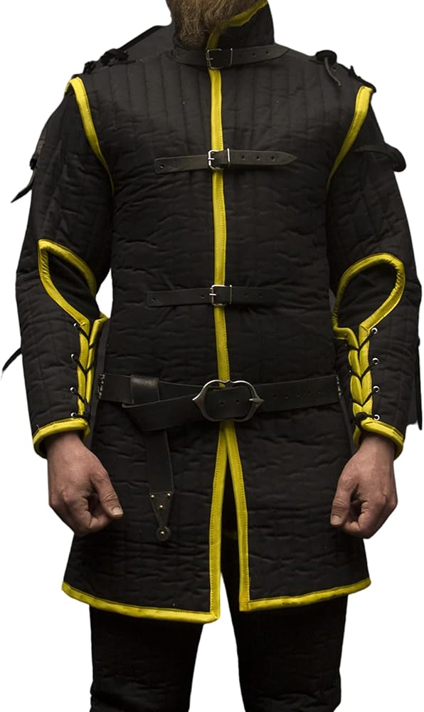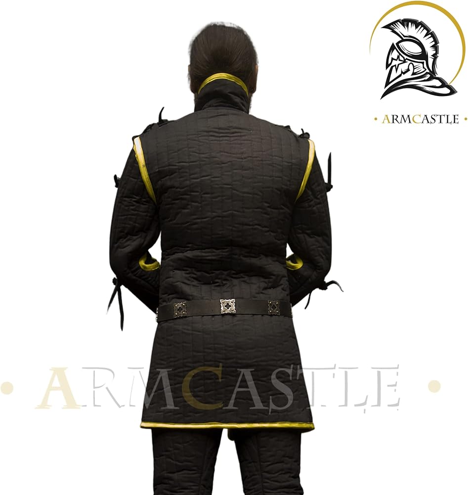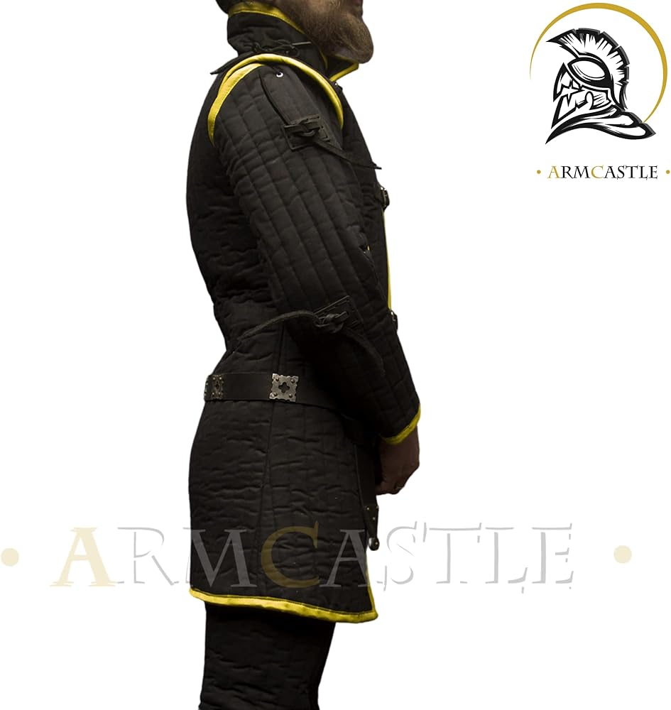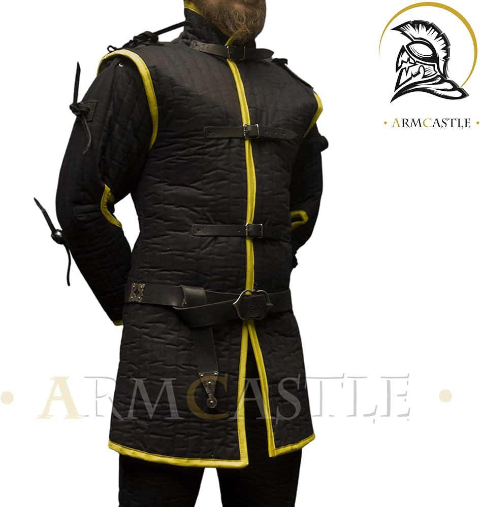 When you want excellent protection during battle, the Arthur Canvas Gambeson Set is your ideal solution. The padded armor includes a gambeson, tassets, and sleeves in a versatile set that can be worn in different combinations. The padded gambeson can be worn under many kinds of armor to help prevent rubbing and pinching. The tall collar increases comfort around the neck, as well. The armor padding is stitched in a diamond or straight verticle pattern that allows movability and keeps the padding in place. The front of the medieval gambeson is fastened with four buckled straps. With versatility, this gambeson is both pleasant to the touch and stylish and great for costumes and re-enactments