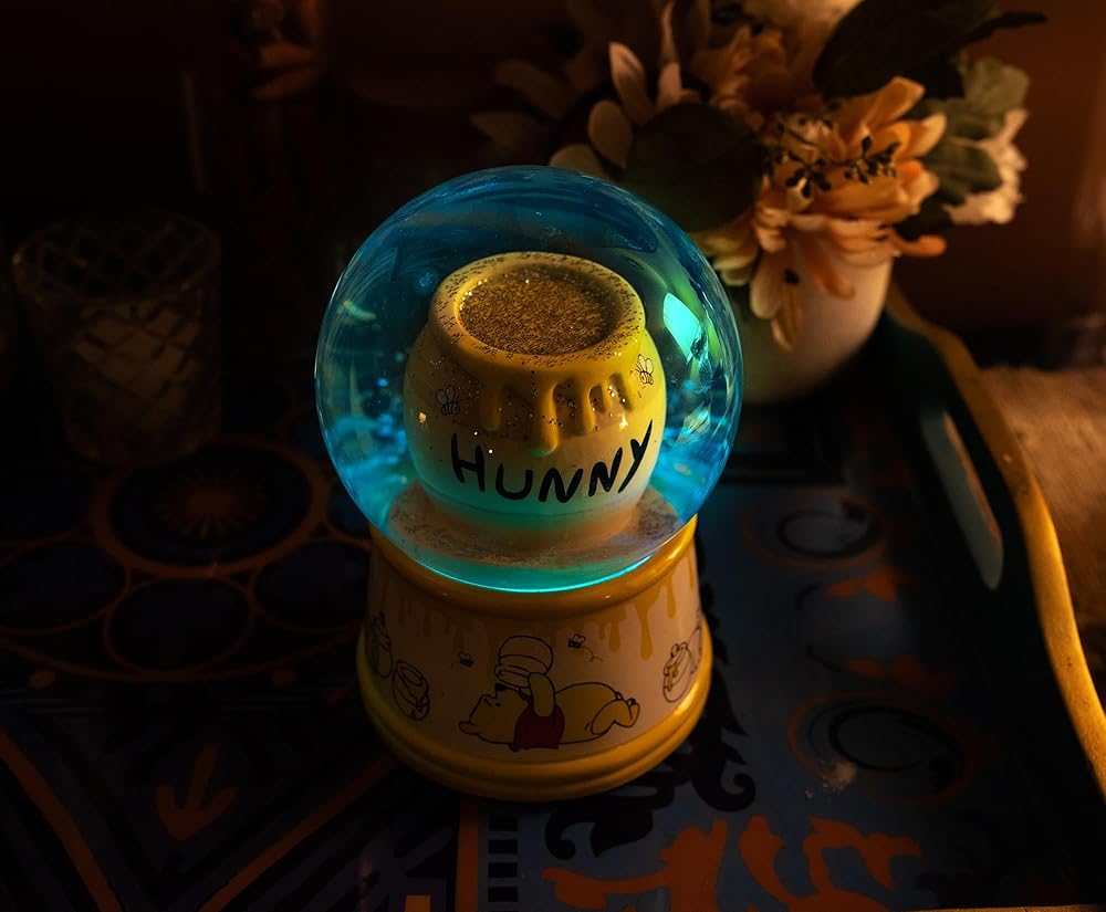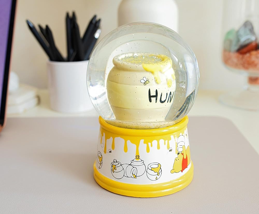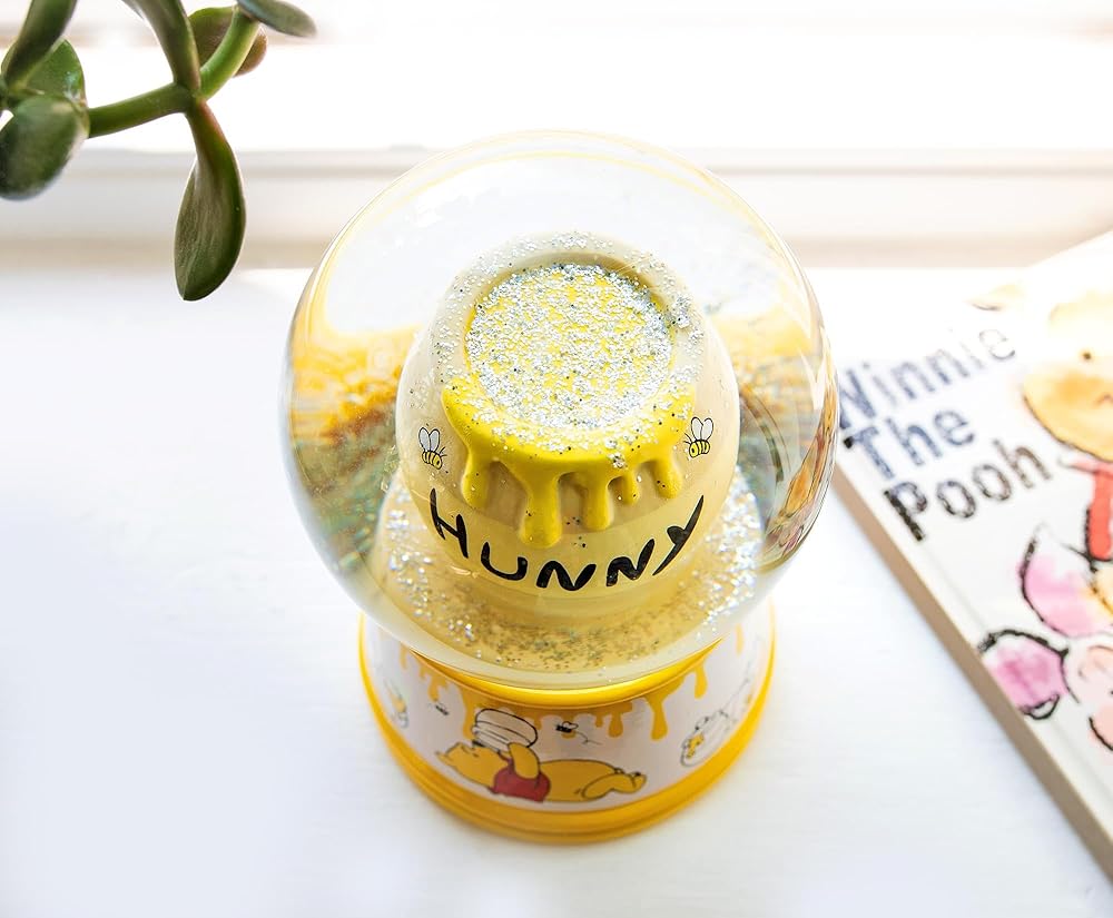 IS YOUR TUMBLY FEELING RUMBLY: What's all the buzz about? This snow globe features a classic hunny pot surrounded by floating gold sparkles, while the bottom sees that silly ol' bear trying to get that one last drip while bees circle above.