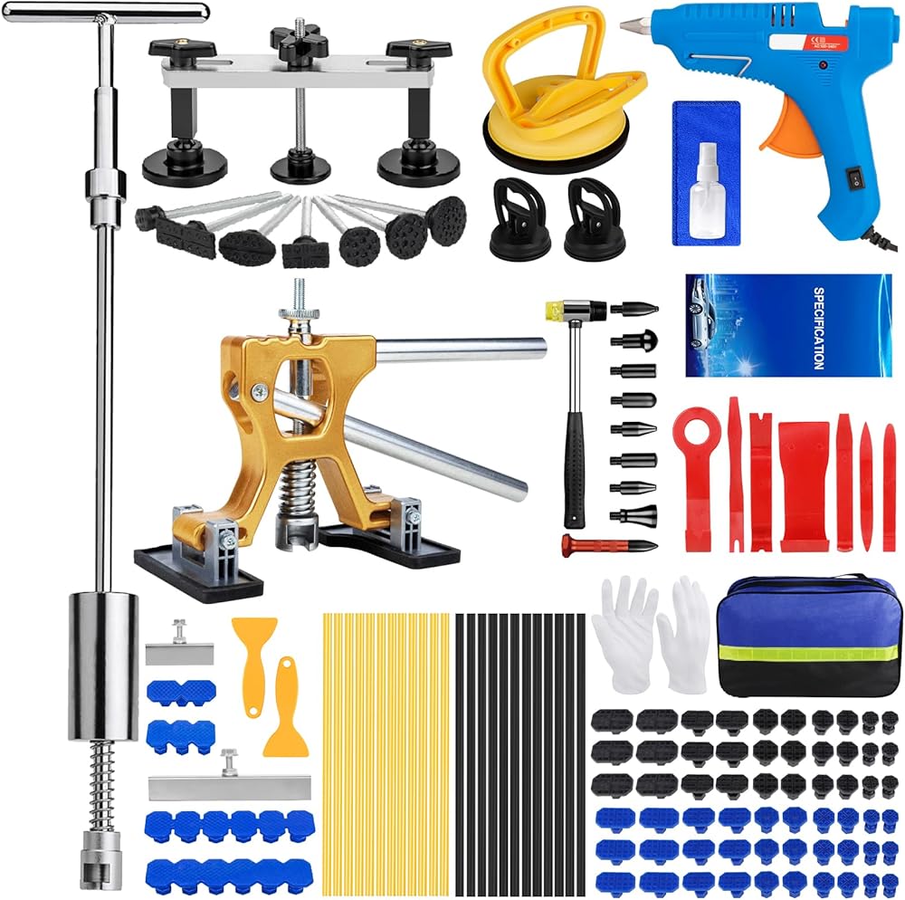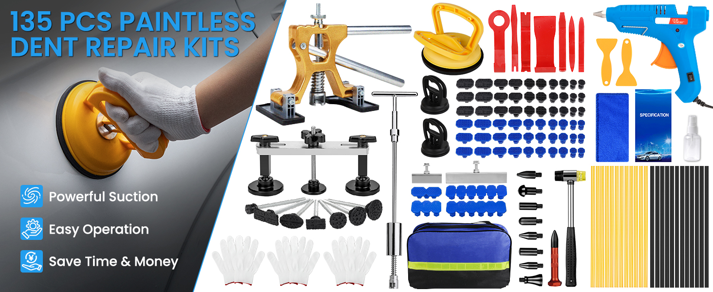 🚕 【مجموعة أدوات سحب انبعاجات السيارة مكونة من 135 قطعة】 - مجموعة أدوات إصلاح انبعاجات السيارة الكل في واحد من بوليساك تأتي مع دعم فني مدى الحياة وهي مثالية لإصلاح سيارتك أو شاحنتك أو سيارات الدفع الرباعي أو الدراجة النارية، بما في ذلك ساحب T-bar 3 في 1، ساحب جسر قابل للتعديل ورافع ذهبي، كوب شفط قوي، لاصق غراء 100 وات، عصا غراء عالية الجودة، عروة سحب خاصة، مطرقة مطاطية وأداة إزالة داخلية للسيارة. سواء كنت تقوم بإصلاح انبعاج صغير أو تتعامل مع تلف كبير في الجسم، فإن مجموعة إصلاح الانبعاجات هذه تحتوي على كل ما تحتاجه.