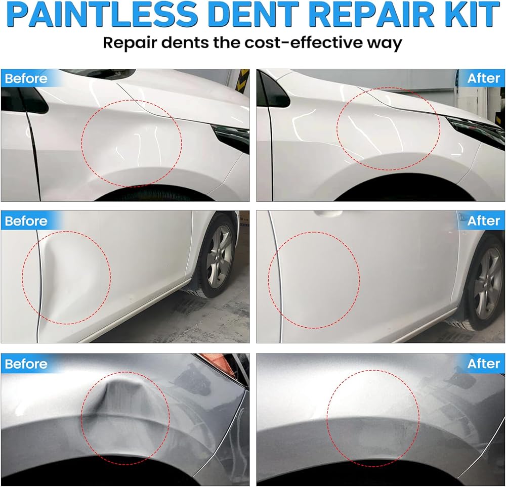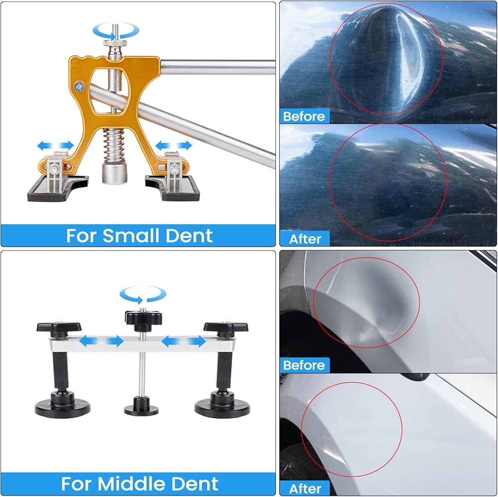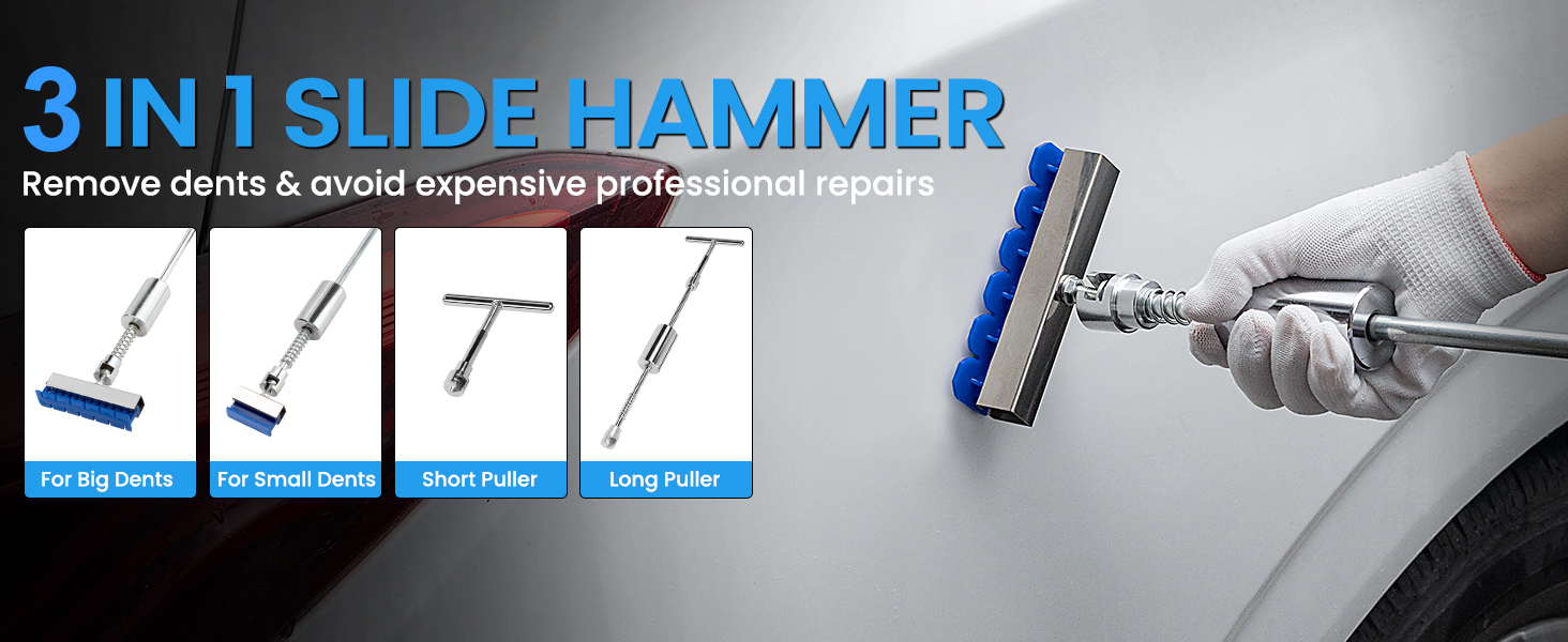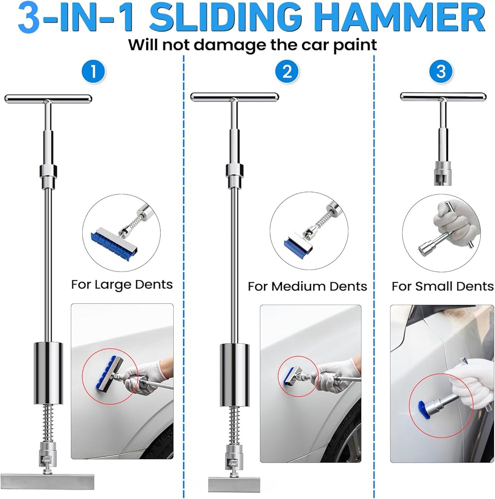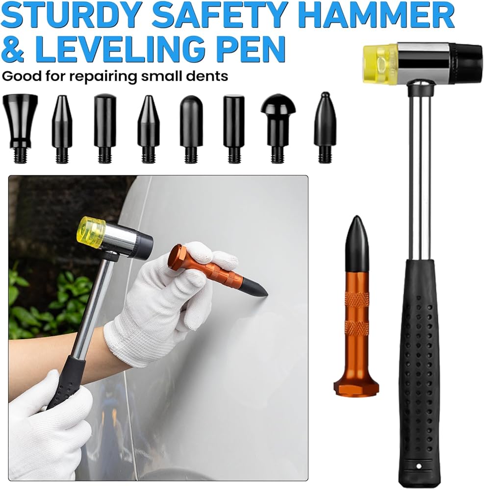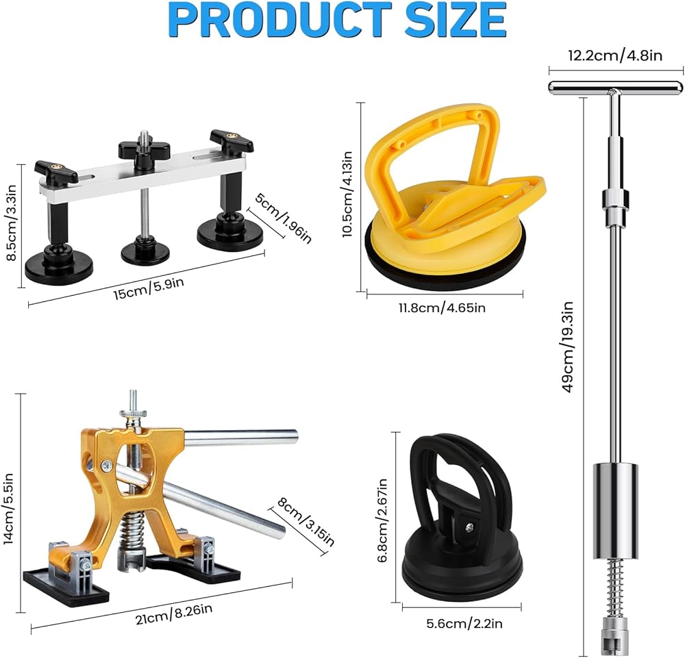 5 أدوات إصلاح قوية - سواء كانت انبعاجًا كبيرًا أو متوسطًا أو صغيرًا، يمكنك استخدام المطرقة المنزلقة 3 في 1 على شكل حرف T، أو استخدام 3 أكواب شفط للإصلاح، فإن الشفط القوي يجعل إصلاح الانبعاجات سريعًا. بالنسبة للخدوش المتوسطة، يمكنك استخدام ساحب الجسر. بالنسبة للخدوش الصغيرة غير المستوية، يمكنك استخدام مطرقة مطاطية وقلم تسوية. بالنسبة للخدوش الصغيرة، يمكنك استخدام رافع الذهب لضبط العرض والارتفاع دون الإضرار بطلاء السيارة، وحل مشكلة الانبعاج بسرعة وفعالية!