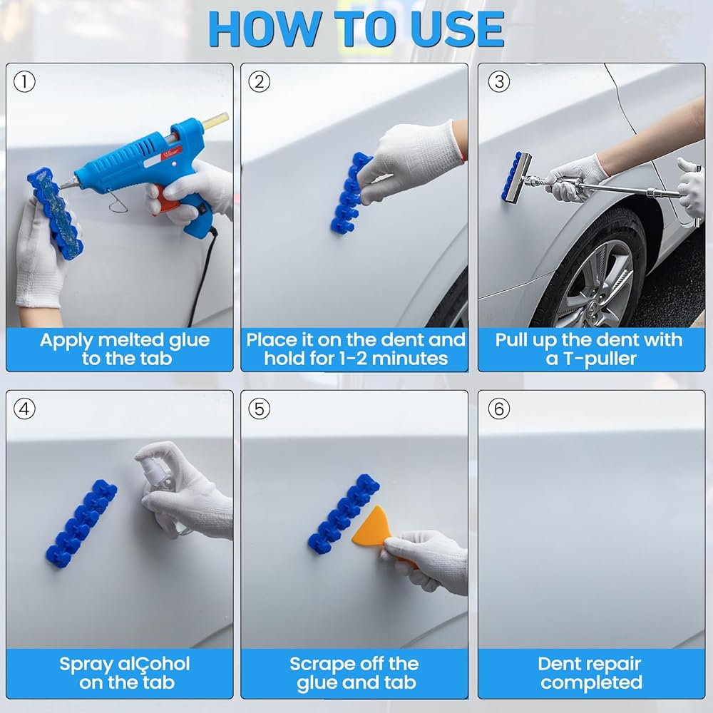 🚕 【كيفية استخدام أداة سحب الدنت】 - الخطوة 1، نظف سطح السيارة، وقم بتسخين مسدس الغراء وعصا الغراء لمدة 3-5 دقائق. الخطوة 2، ضعي عصا الغراء الساخنة على لسان السحب. الخطوة 3، قم بلصق لسان السحب على الانبعاج واضغط لمدة دقيقتين. الخطوة 4، استخدم الأداة لسحب الانبعاج وحاول عدة مرات. الخطوة 5، بعد إصلاح الانبعاج، قم بتنظيف الغراء الزائد على سطح السيارة والأداة باستخدام اللاكحل. تأتي مجموعة إصلاح جسم السيارة مع فيديو تفصيلي، ويمكن للفتيات أيضًا إصلاح الخدوش بسهولة.