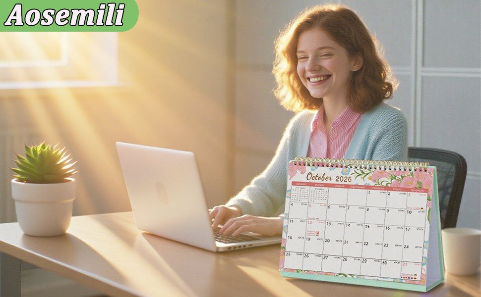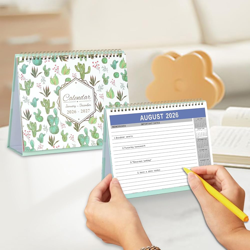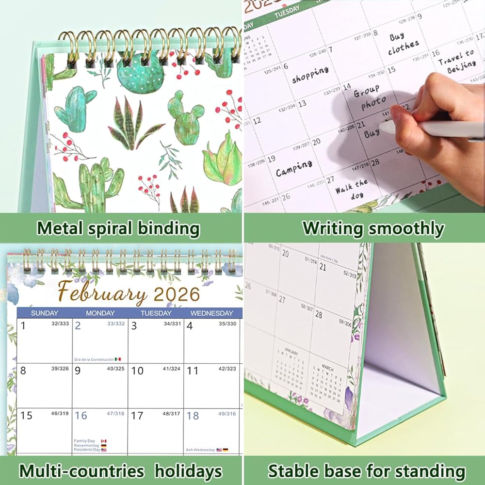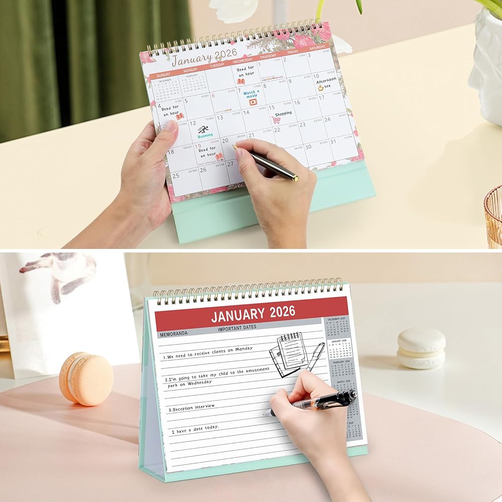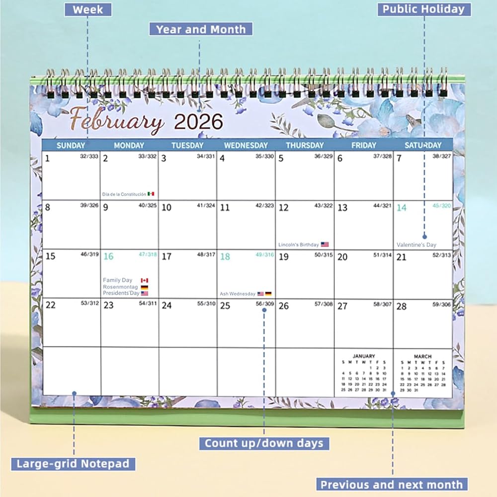 - المزايا العملية: شكل قلاب واقف مع تقويمات مرجعية للأشهر السابقة والقادمة، يتضمن مساحة مخصصة لقوائم المهام والملاحظات