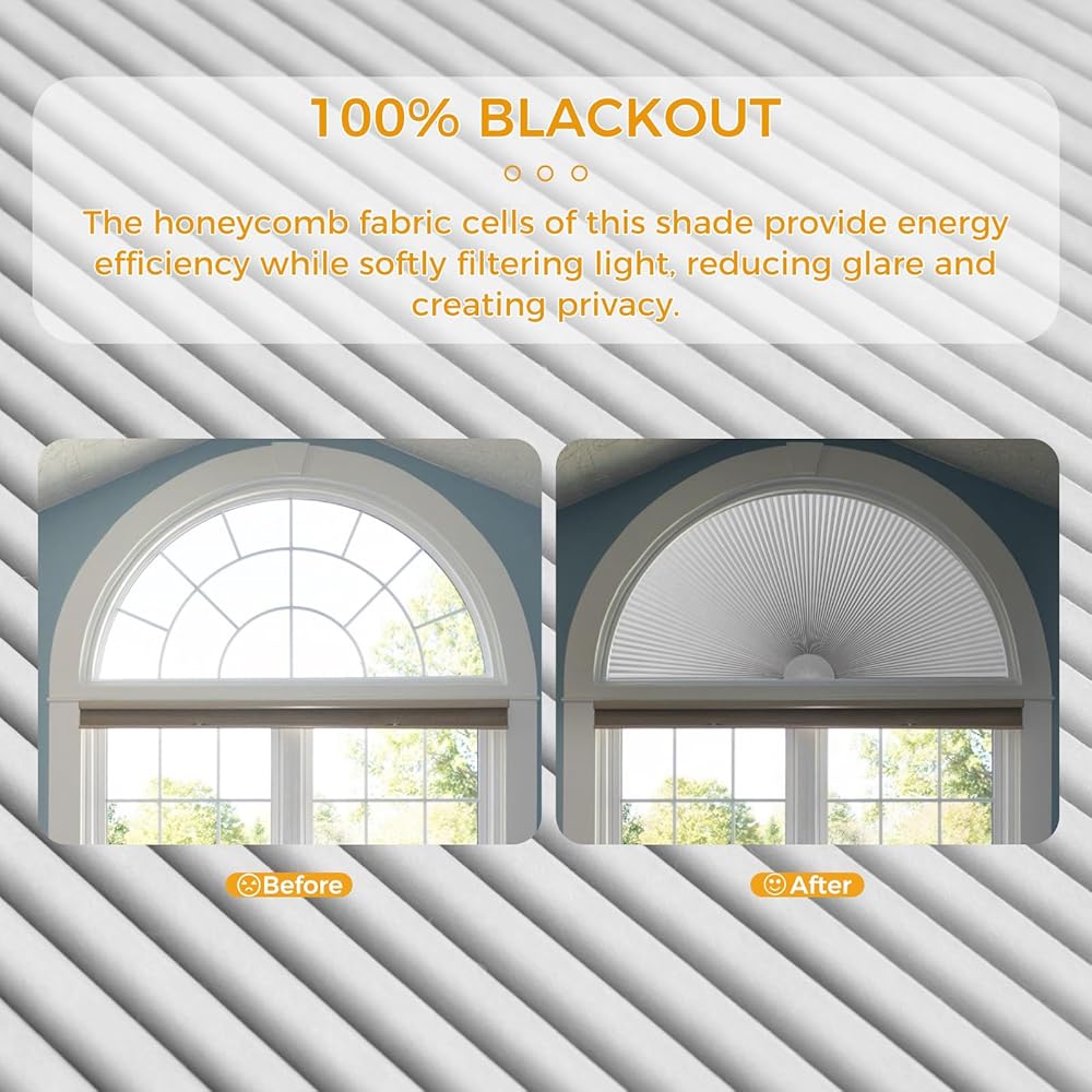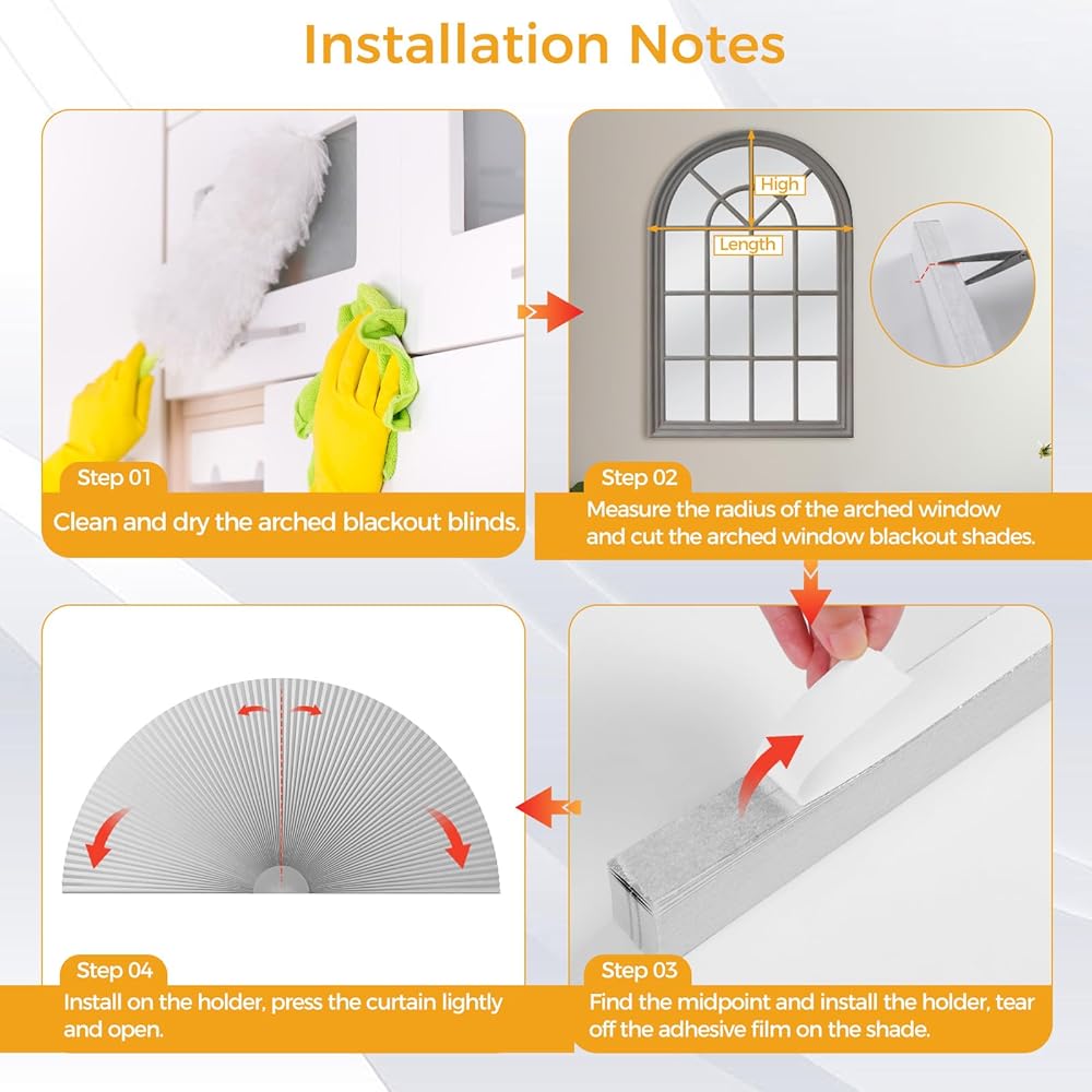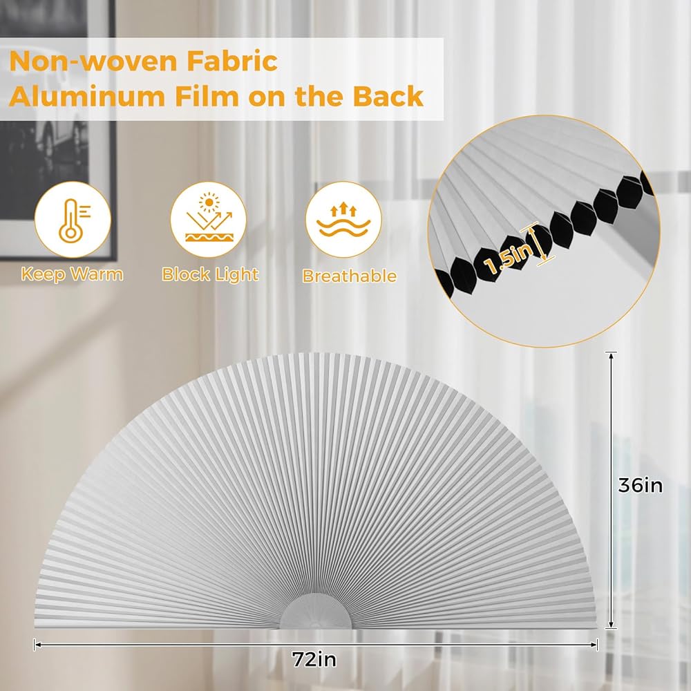 • ✔️حجم قابل للتعديل -- سوف تحصل على ظل نافذة مقوس واحد مع نصف قطر 91.44 سم، وهو مناسب للنوافذ المقوسة التي يتراوح نصف قطرها بين 6 و91.44 سم. يرجى القص وفقًا لنصف القطر الفعلي للنافذة.