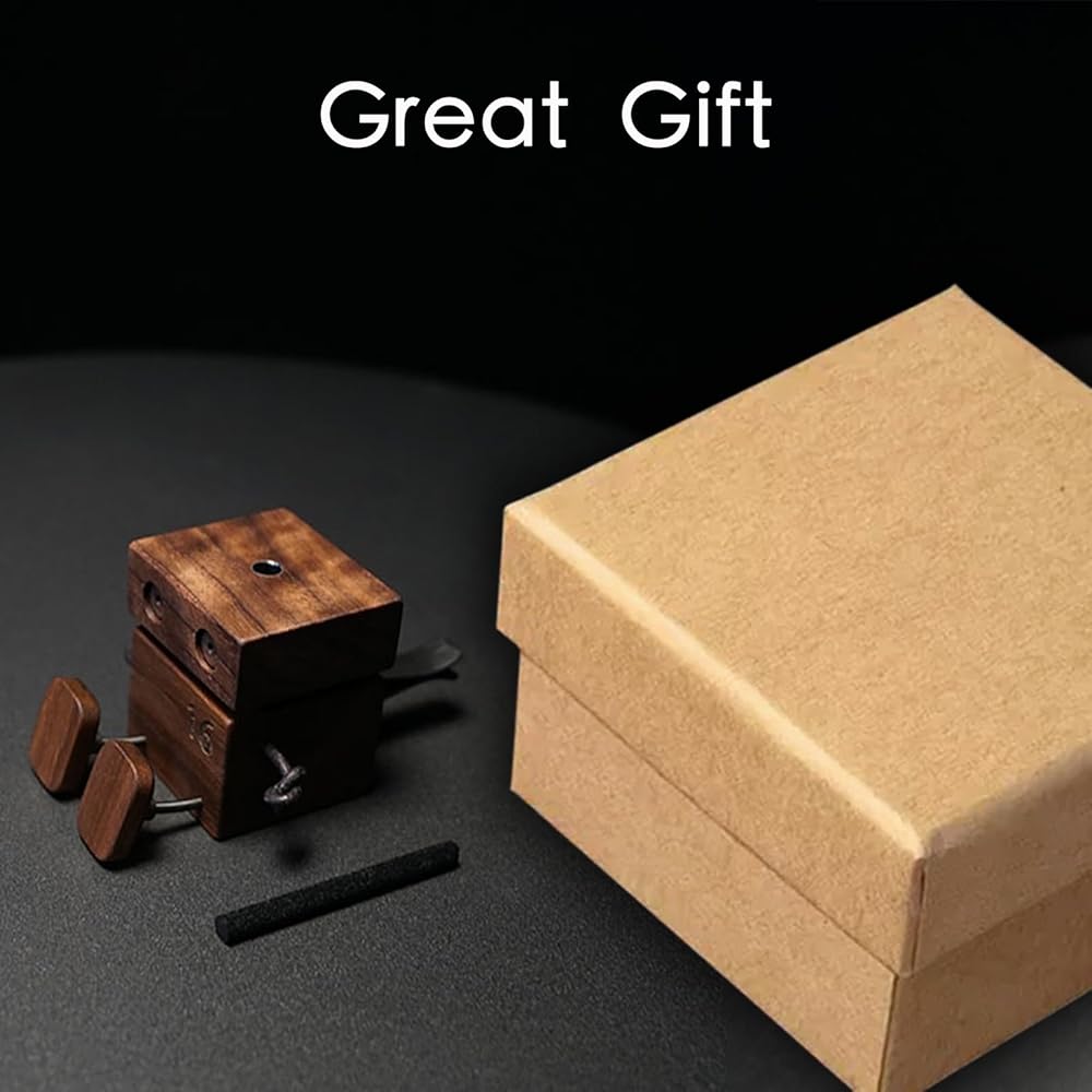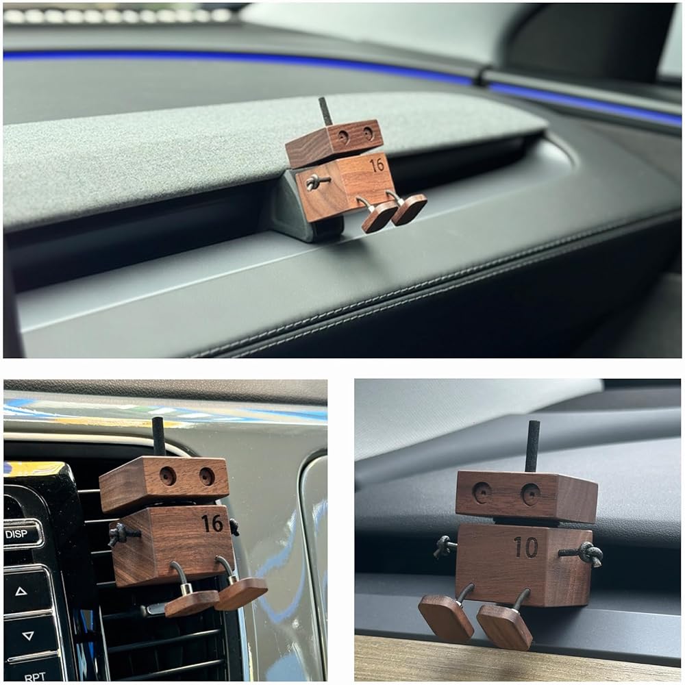 This adorable walnut wood robot dances on your dashboard, filling your car with custom scents and smiles.