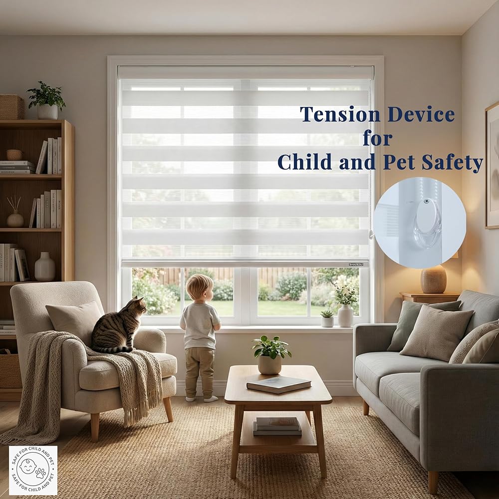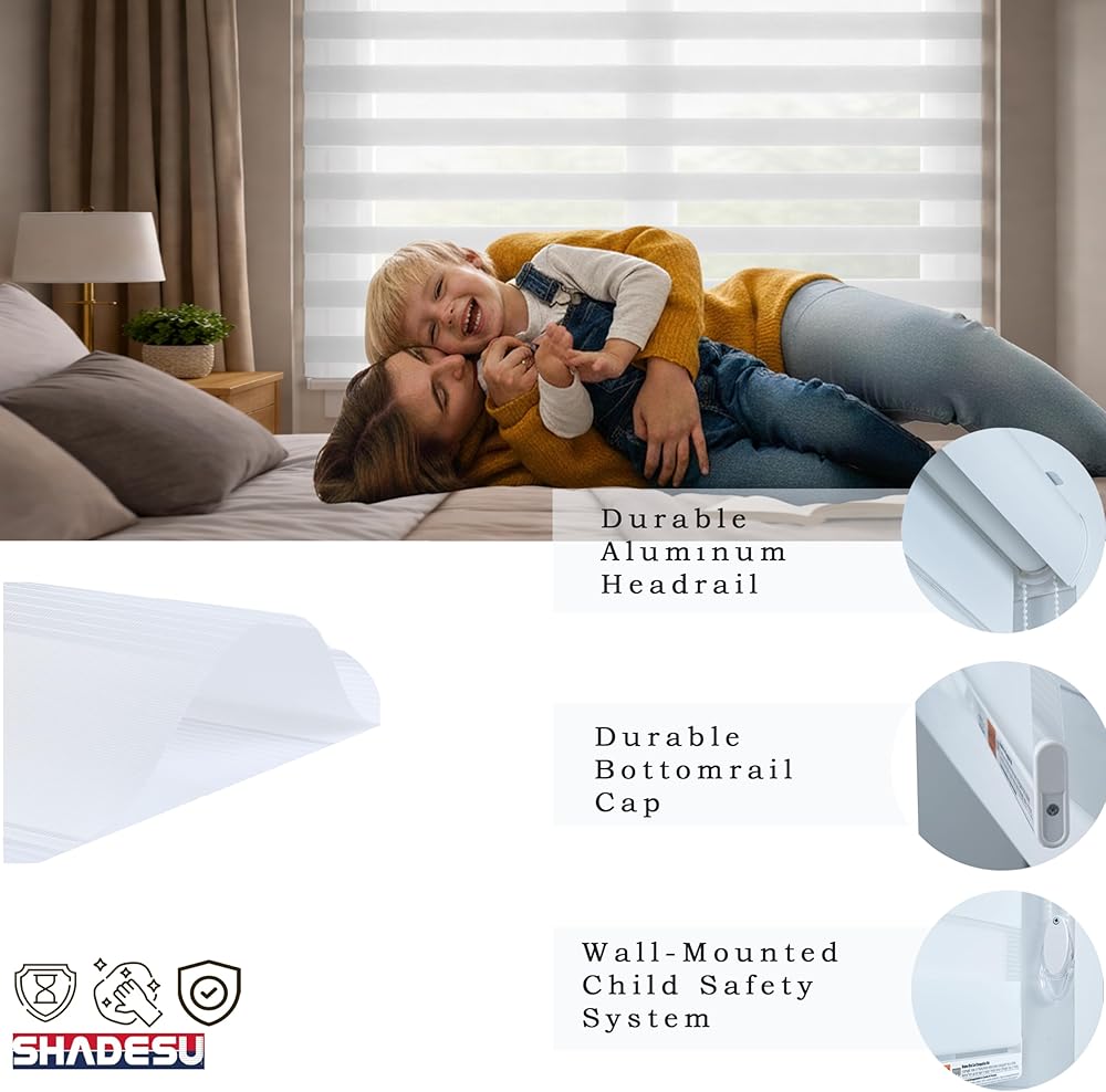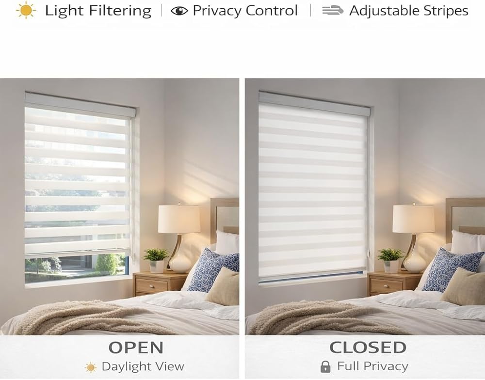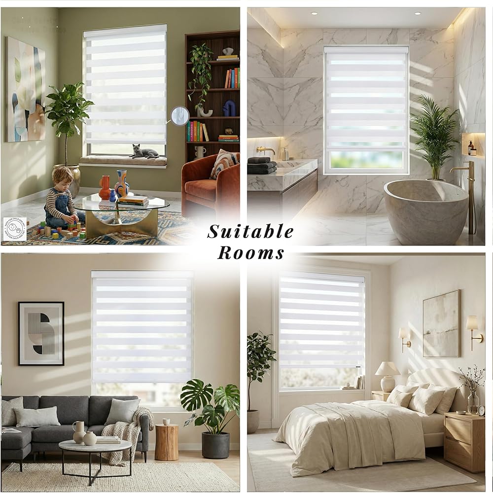 Made from 100% premium polyester,excellent ventilation, and are anti-static, dust-proof, and durable. Featuring a breathable dual-layer design with alternating sheer and solid fabrics, they provide customizable privacy and light filtration. With superior UV protection and long-lasting durability, blinds are perfect for year-round use. Dual-layer zebra blinds allow you to switch between sheer and light-filtering stripes, providing balanced daylight and approximately 75% light blocking for privacy
