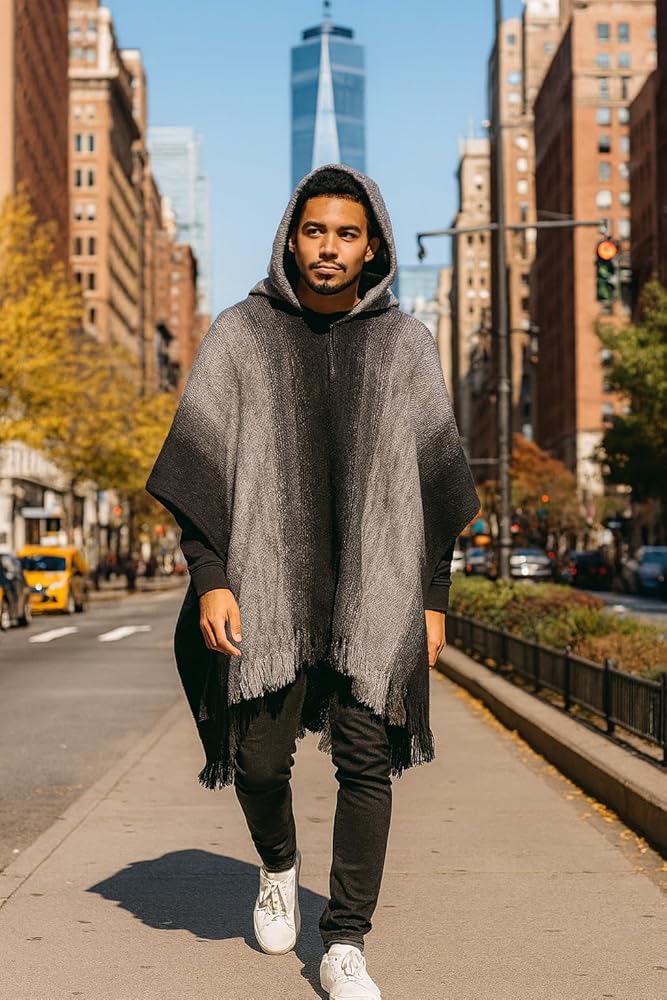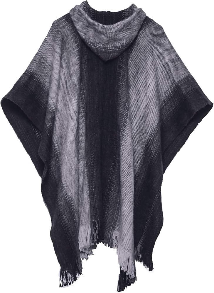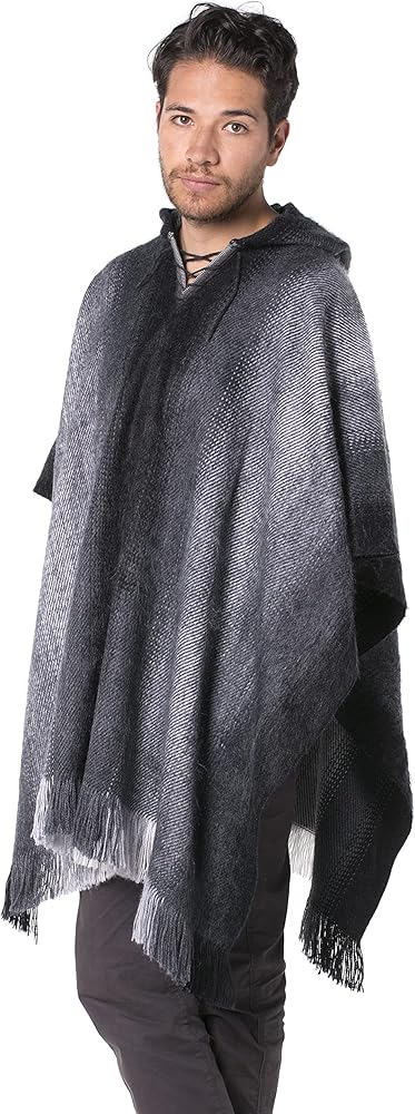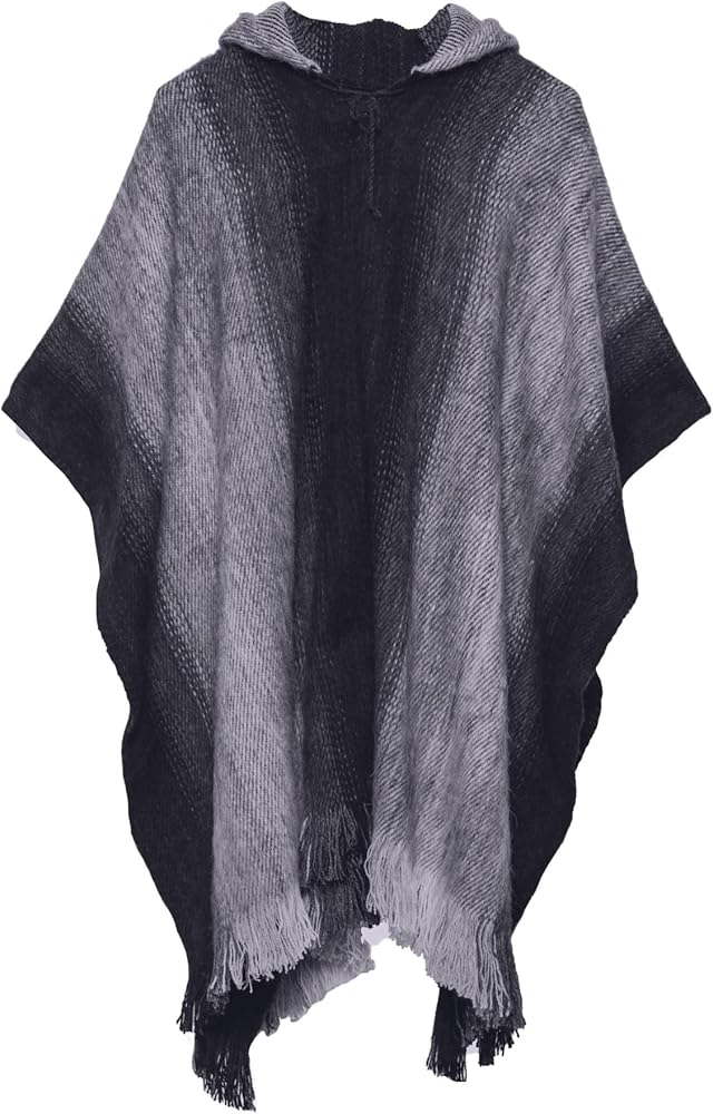 معطف ريفي أبيض بغطاء رأس مع خطوط باللون البني والأبيض. مصنوع يدويًا من مزيج من صوف الألبكة بنسبة 90%، سيبقيك هذا المعطف دافئًا في أيام الشتاء الباردة.