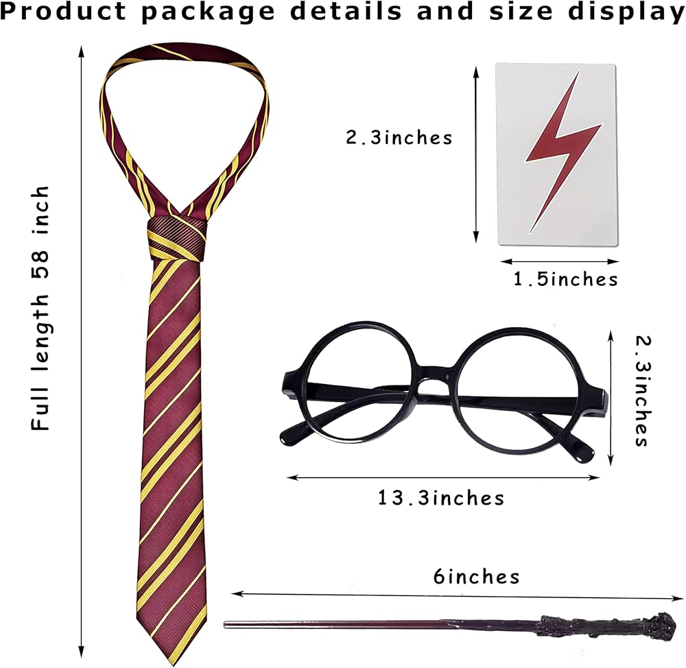 الحجم المناسب: قياس النظارات 5 بوصات عرضًا وطول 5.5 بوصات، وقياس ربطة العنق 57 بوصة × 7 بوصات طولًا، وقياس العصا 13.5 بوصة طولًا. غير مناسبة للاستخدام من قبل الأشخاص الذين تقل أعمارهم عن 12 عامًا.