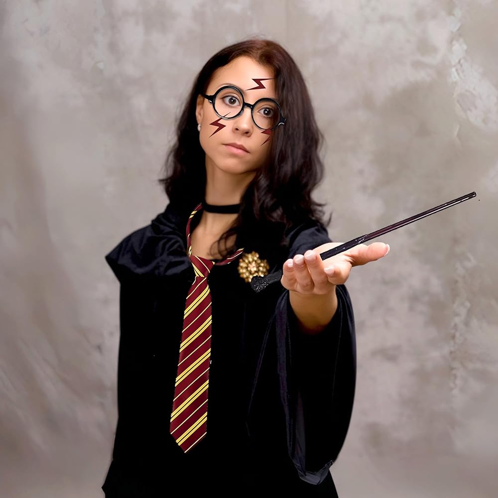 ما تحصل عليه: تتضمن مجموعة إكسسوارات أزياء الساحر هذه زوجًا من النظارات الدائرية، وربطة عنق مخططة باللون الكستنائي والأصفر، وعصا سحرية و6 قطع من ملصقات البرق.