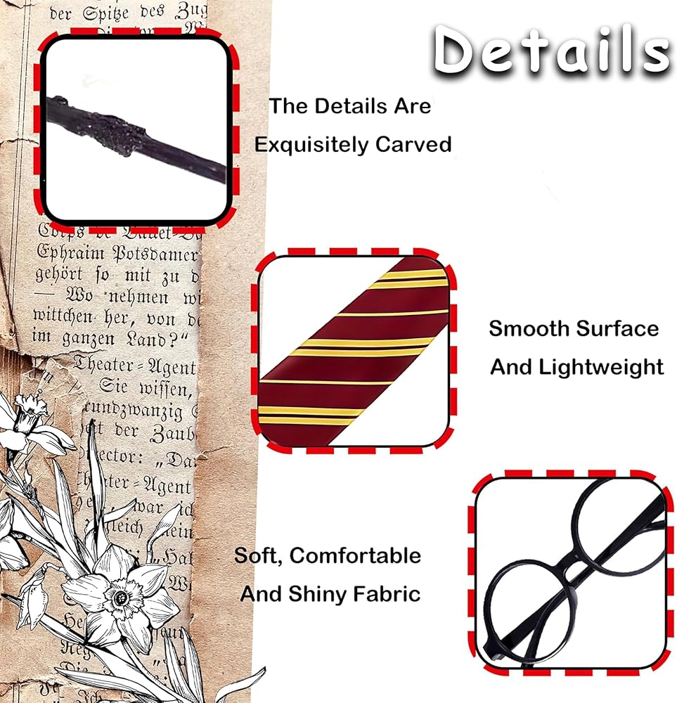 خامة عالية الجودة: ربطة العنق التنكرية مصنوعة من نسيج بوليستر ناعم عالي الجودة، نظارات ساحرة (بدون عدسات) مصنوعة من البلاستيك، مما يضمن أنها ستصمد أمام المغامرات الساحرة لأي ساحر طموح