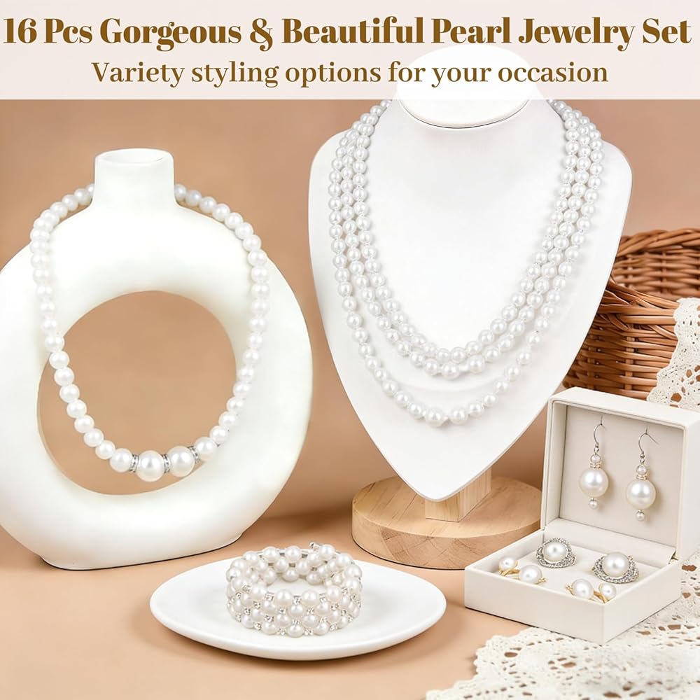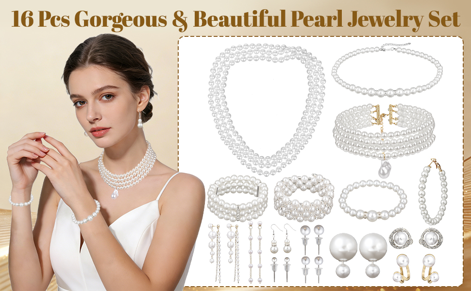【مجموعة مجوهرات اللؤلؤ الكل في واحد مكونة من 16 قطعة: مجموعة متنوعة لا مثيل لها لكل مظهر】 تتضمن مجموعة اللؤلؤ ذات القيمة العالية هذه 3 قلادات لؤلؤ متعددة الاستخدامات للنساء (قلادة + طبقات + قلادة طويلة)، 3 أساور أنيقة (سوار مطاطي من اللؤلؤ + سوار مطاطي من 3 طبقات + 4 طبقات مزخرفة على شكل زركون قابلة للتعديل)، و10 أزواج من أقراط اللؤلؤ - إجمالي 16 قطعة من مجوهرات اللؤلؤ لتغطية الارتداء اليومي والحفلات والمناسبات الخاصة. لا تنفد أبدًا من خيارات التصميم للعمل أو المواعيد أو حفلات الزفاف.