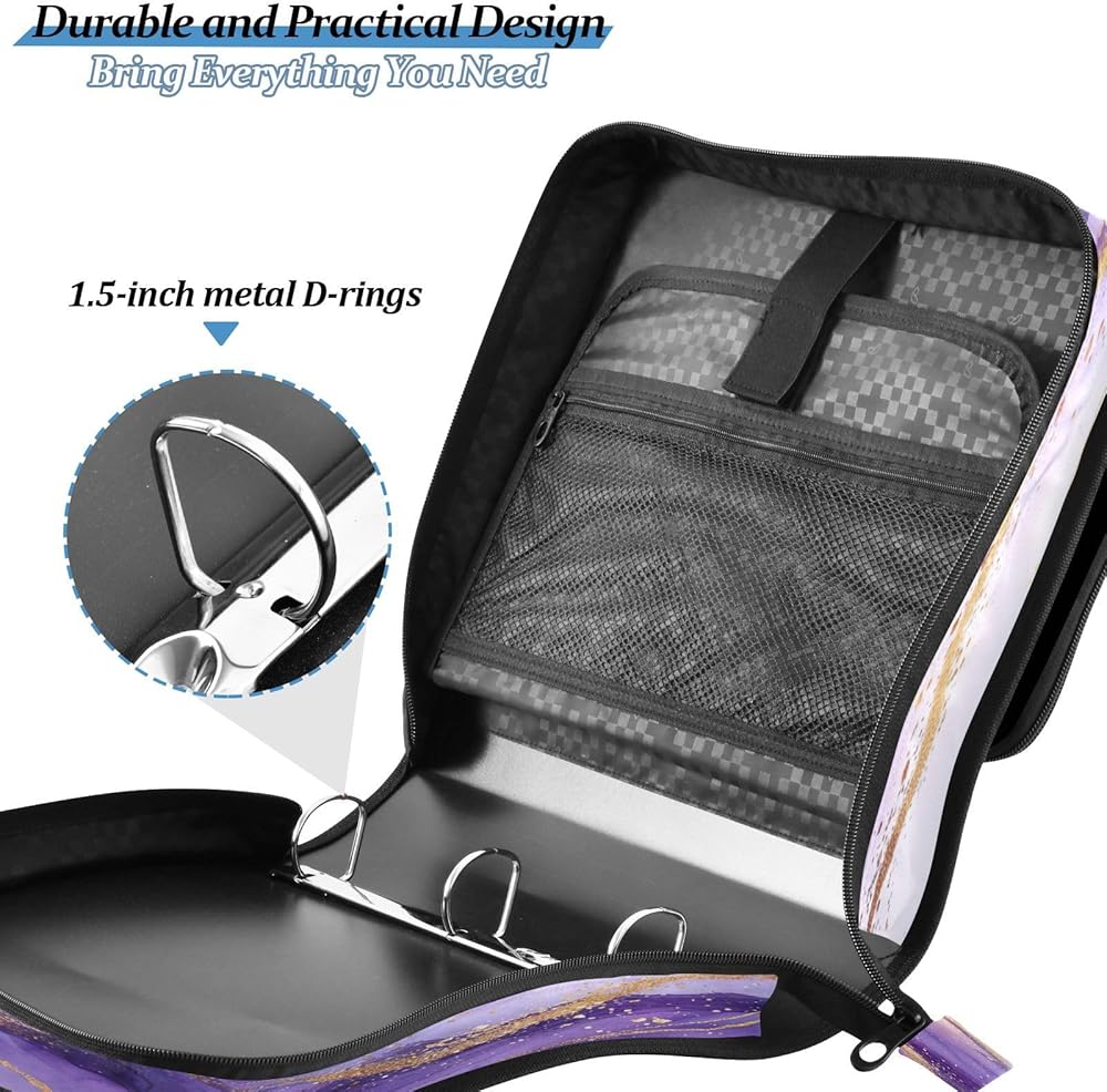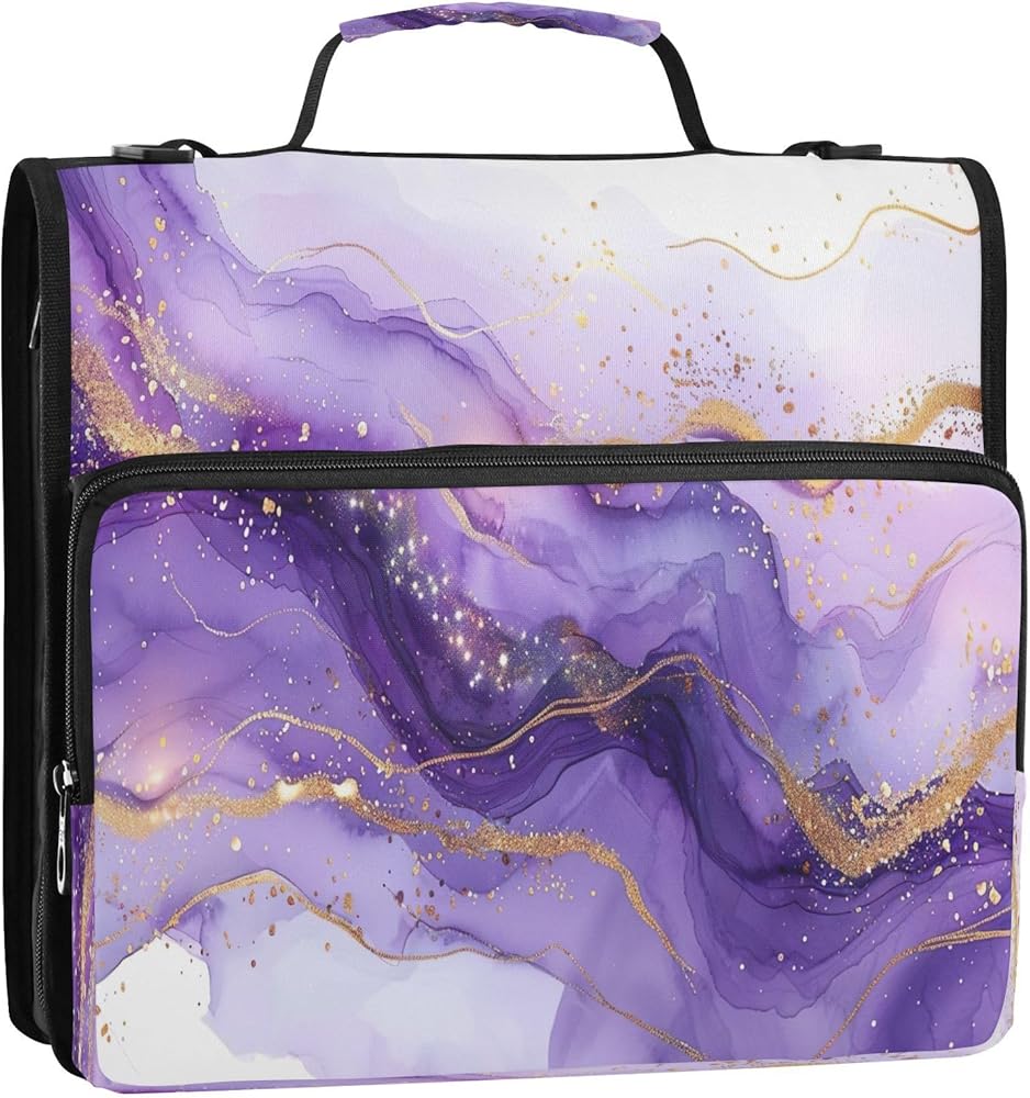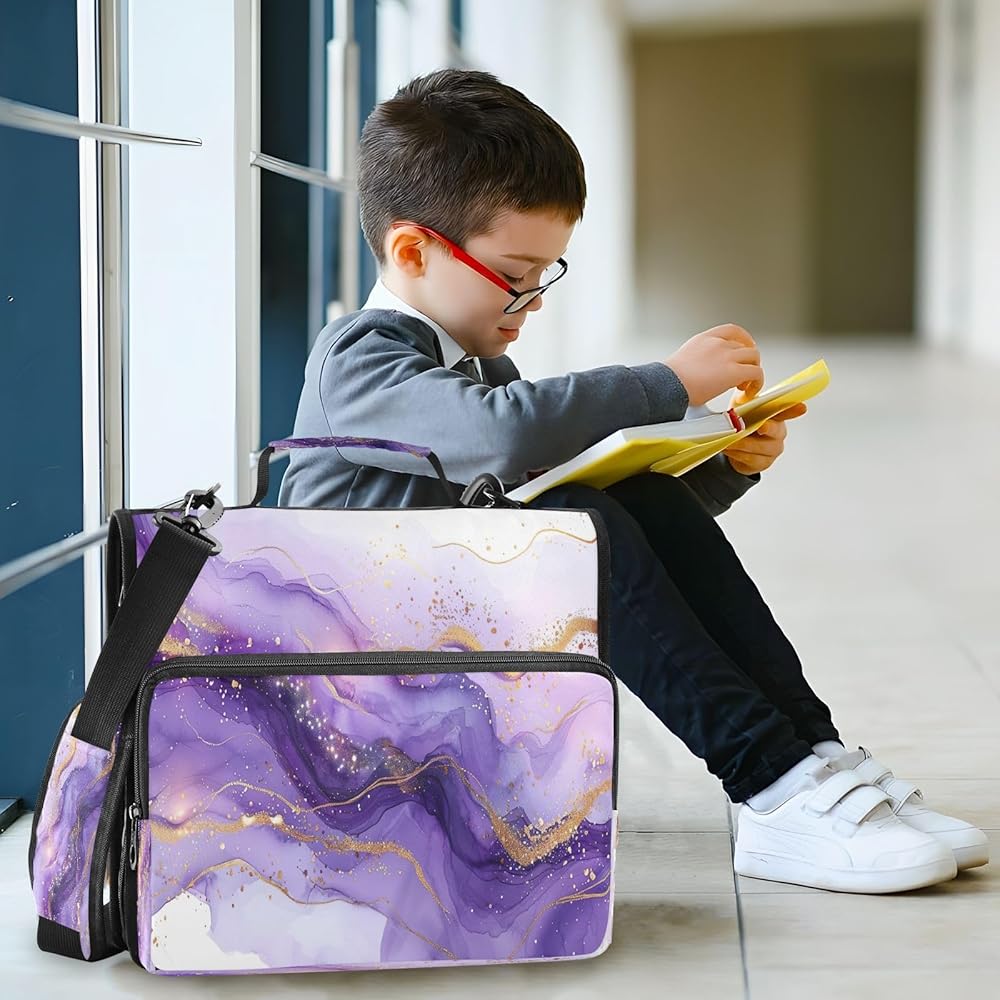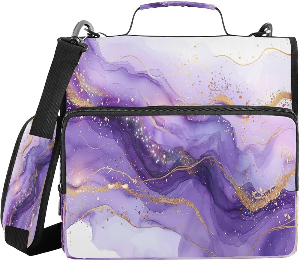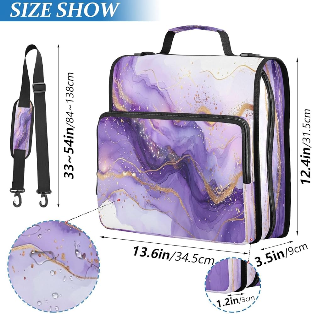 غلاف بسحاب مقاوم للماء من الرخام الأرجواني مع حزام كتف، حافظة صياد ثلاثية الحلقات بتصميم مسطح ومقصورات متعددة للمدرسة والمكتب، للبالغين والأطفال